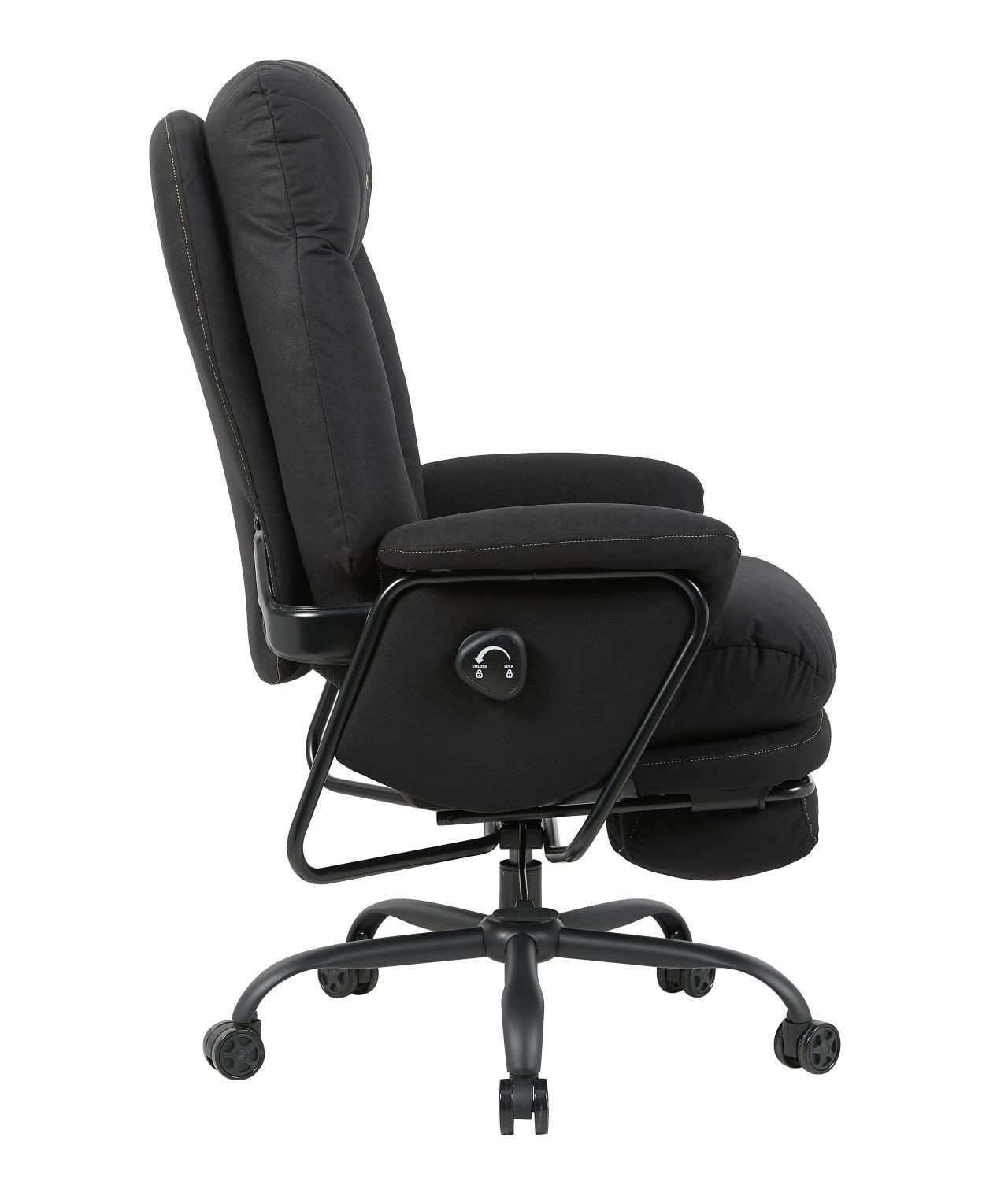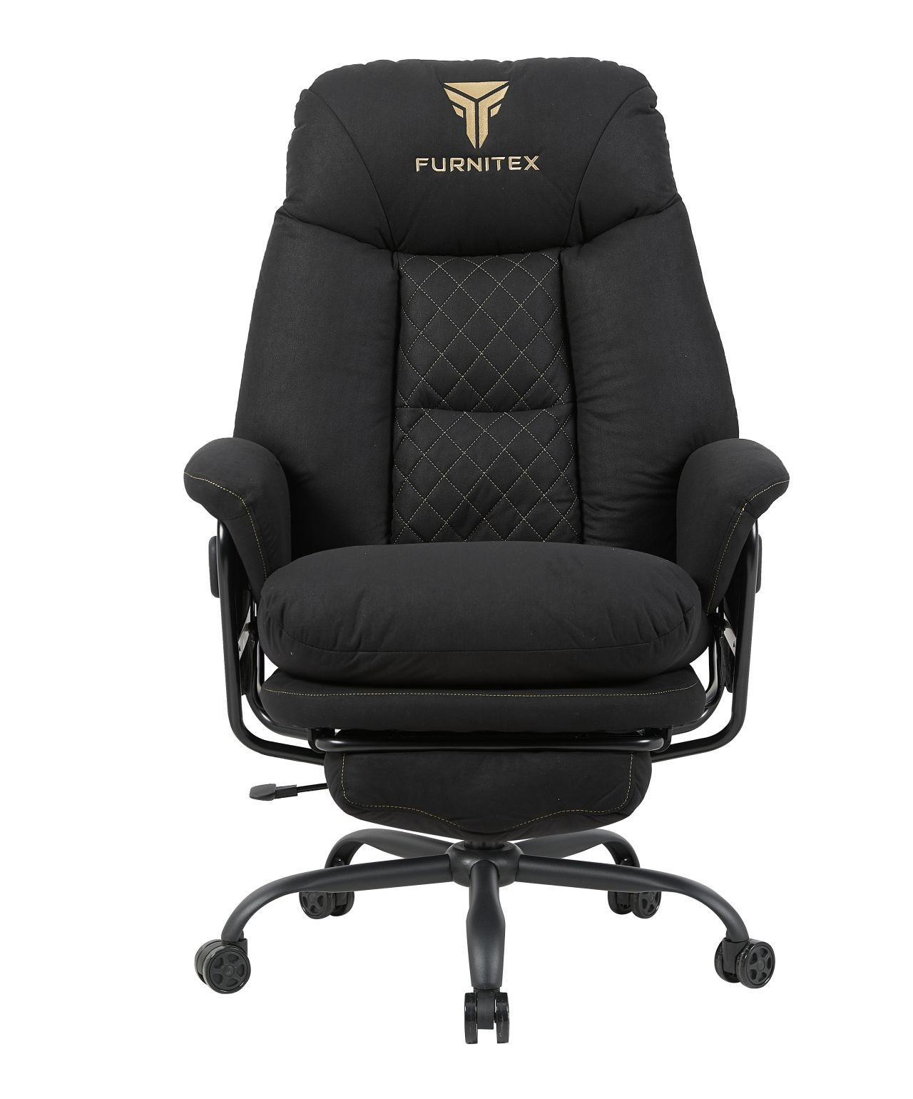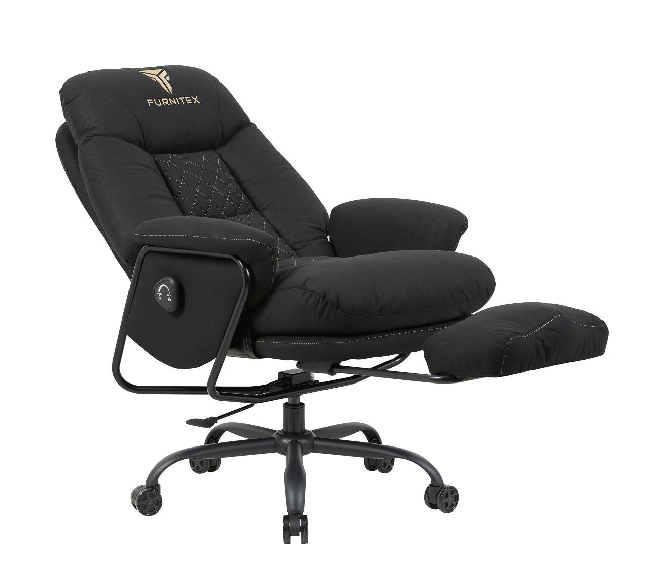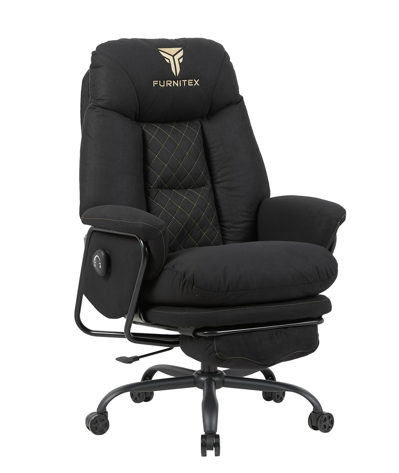 FUNKCE: - mechanismus: MultiBlock - područky: pohyblivé - vysouvací podnožka Rozměry: - celková šířka: 77 cm - šířka sedáku: 53 cm - hloubka sedáku: 61 cm - výška opěradla: 75 cm - celková výška: 119-127 cm - výška sedáku: 56-64 cm Materiál - čalounění: látková tkanina - základna: kov lakovaný práškovou barvou - píst třídy 4 Barva: - černá se zlatými vložkami