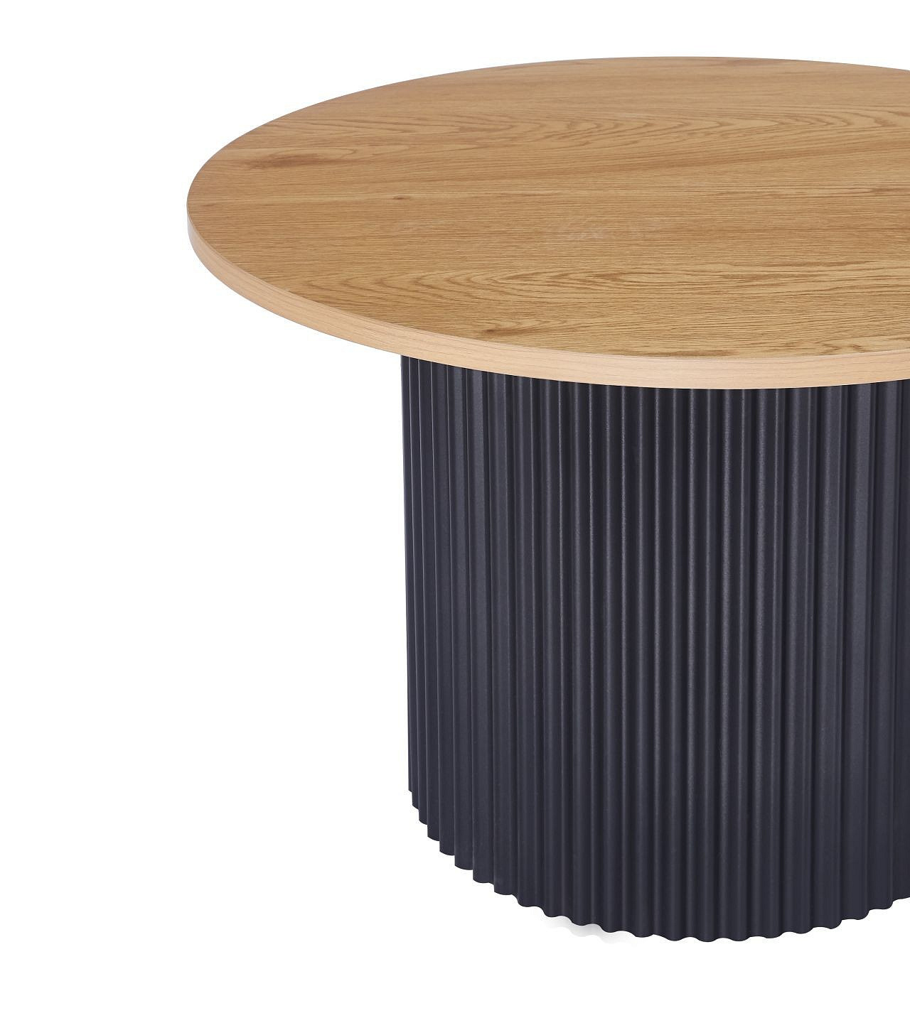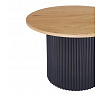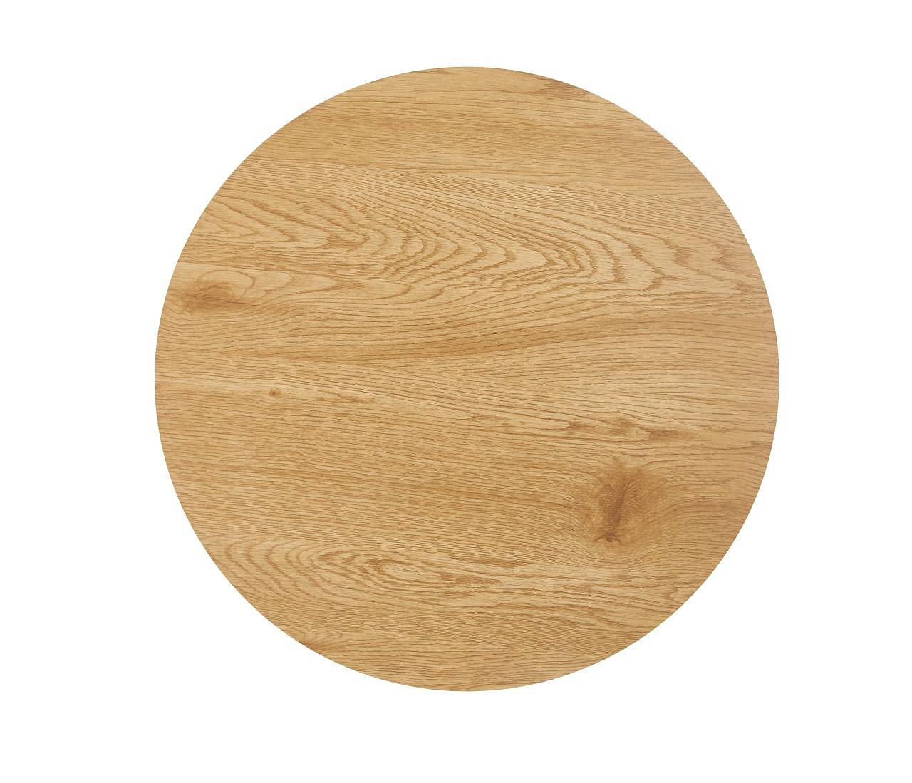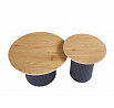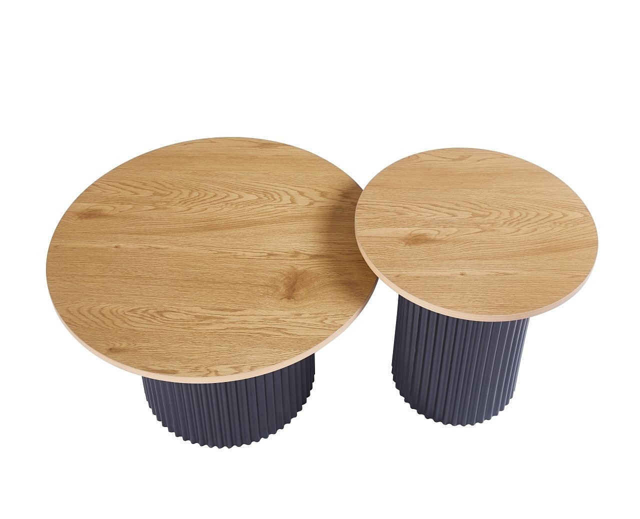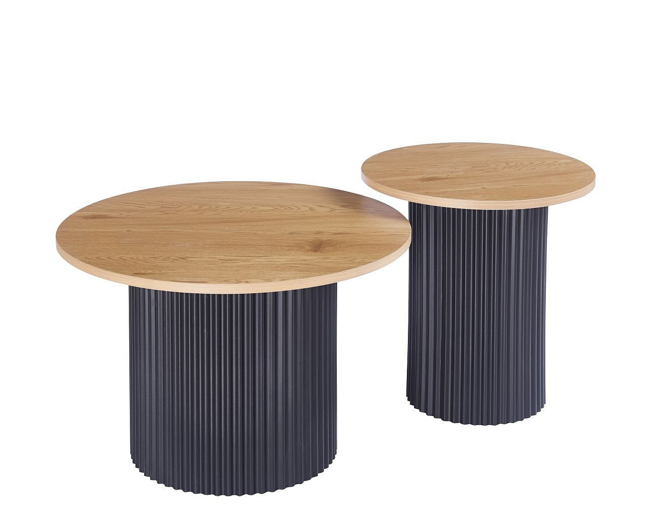 Rozměry: *větší stolek: - deska: průměr: 70 cm - výška: 45 cm *menší stolek: - deska: průměr: 50 cm - výška: 50 cm Materiál: - deska: MDF (dýha) - nohy: kov lakovaný práškovou barvou Barva: - deska: přírodní dub - konstrukce: černá