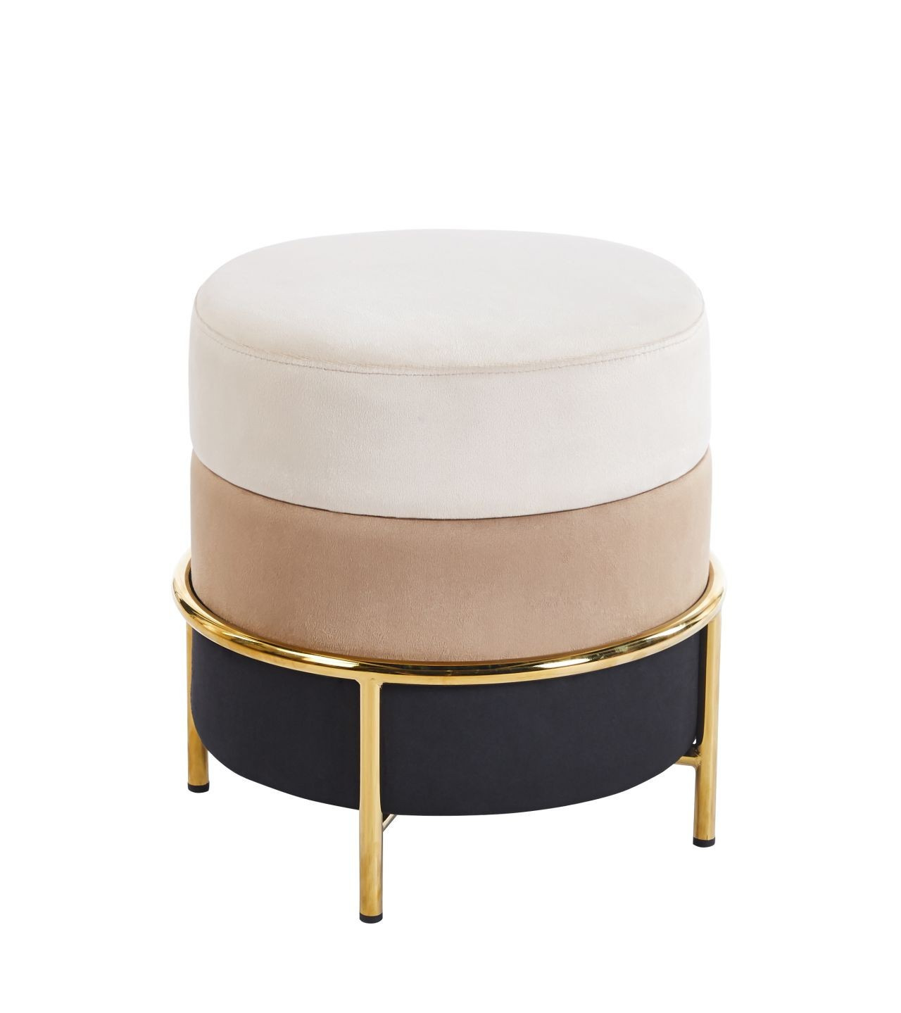 Rozměry: - výška: 40 cm - průměr sedáku: 37 cm - průměr rámu: 40 cm Materiál: - čalounění: sametová tkanina - rám: chrom Barva: - sedák: béžová/cappuccino/černá - rám: zlatá