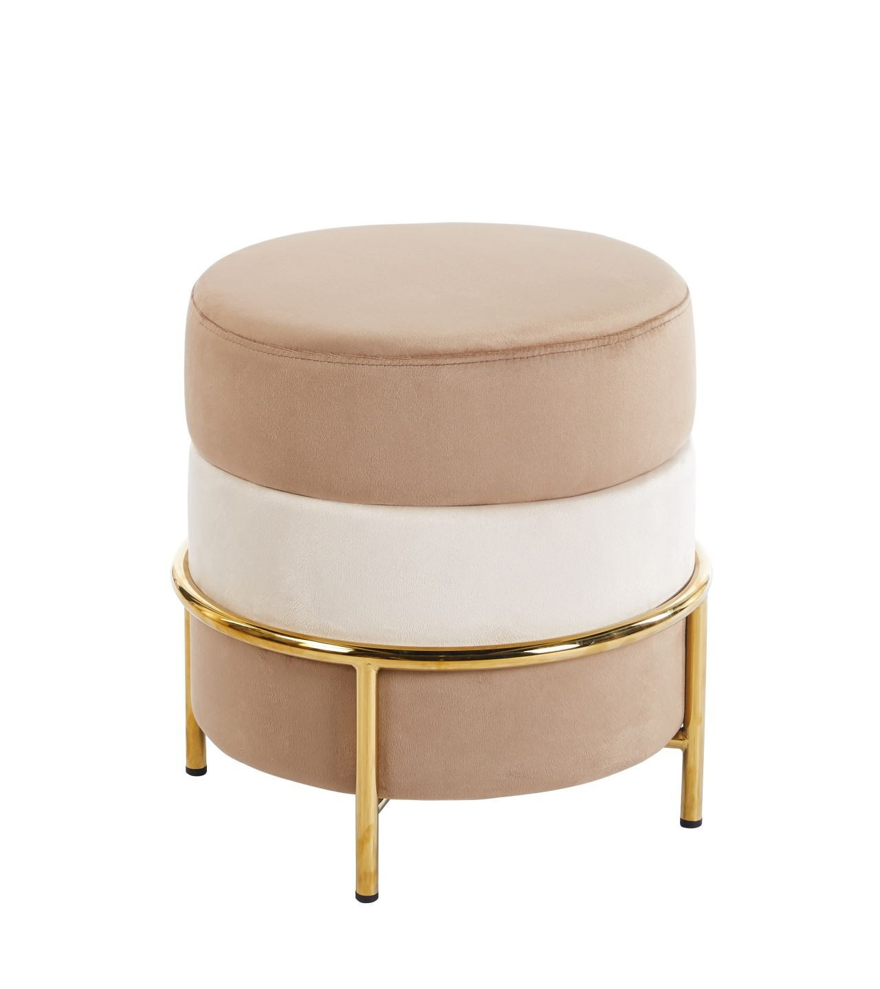 Rozměry: - výška: 40 cm - průměr sedáku: 37 cm - průměr rámu: 40 cm Materiál: - čalounění: sametová tkanina - rám: chrom Barva: - sedák: cappuccino/ béžová/cappuccino - rám: zlatý