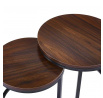 Rozměry: *větší stolek: - deska: průměr 50x50 cm - výška: 43 cm *menší stolek: - deska: průměr 40x40 cm - výška: 38 cm Materiál: - deska: MDF (dýha) - nohy: ocel lakovaná práškovou barvou Barva: - deska: ořech - konstrukce: černá