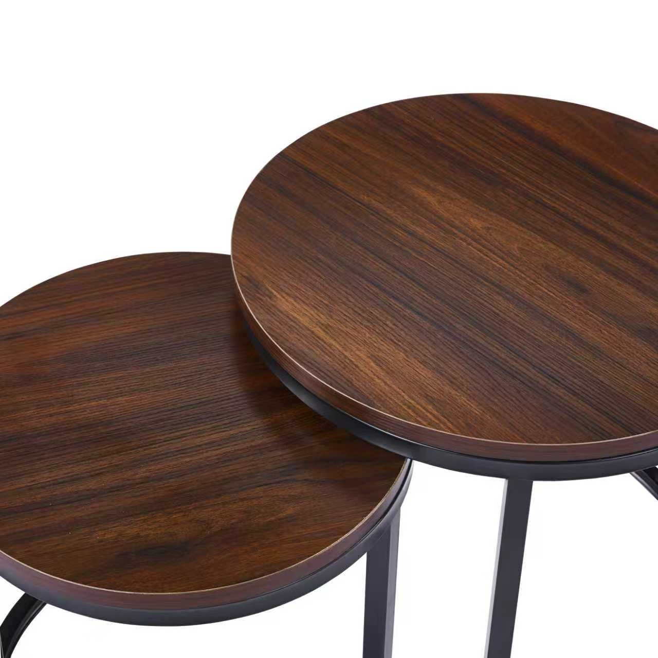 Rozměry: *větší stolek: - deska: průměr 50x50 cm - výška: 43 cm *menší stolek: - deska: průměr 40x40 cm - výška: 38 cm Materiál: - deska: MDF (dýha) - nohy: ocel lakovaná práškovou barvou Barva: - deska: ořech - konstrukce: černá