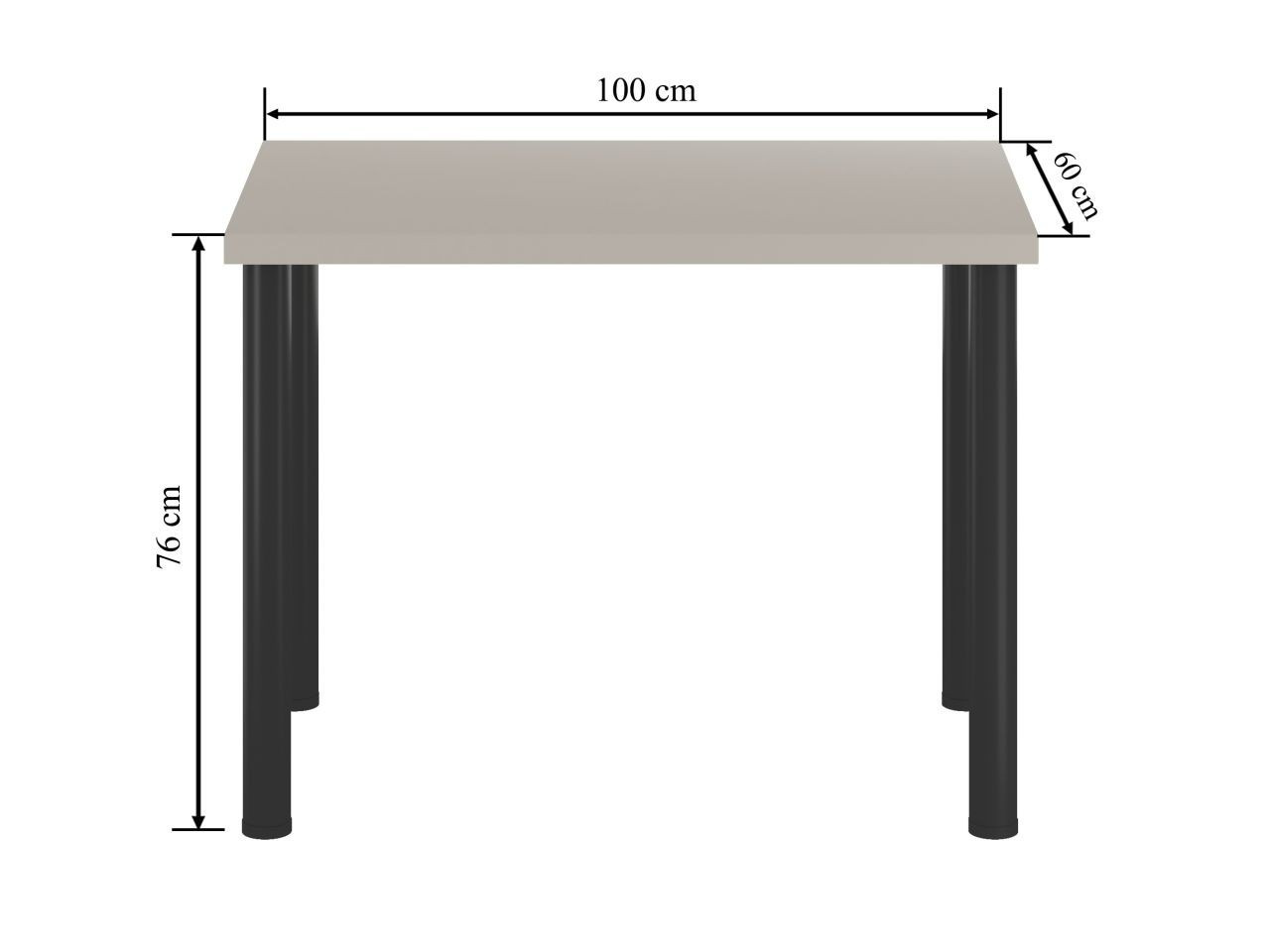 Rozměry: - délka: 100 cm - šířka: 60 cm - výška: 76 cm - tloušťka desky: 3,8 cm Materiál: - deska: laminovaná deska - hrany desky: zakončené ABS plastem - nohy: ocel lakovaná práškovou barvou Barva: - deska: kašmír - nohy: černá
