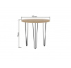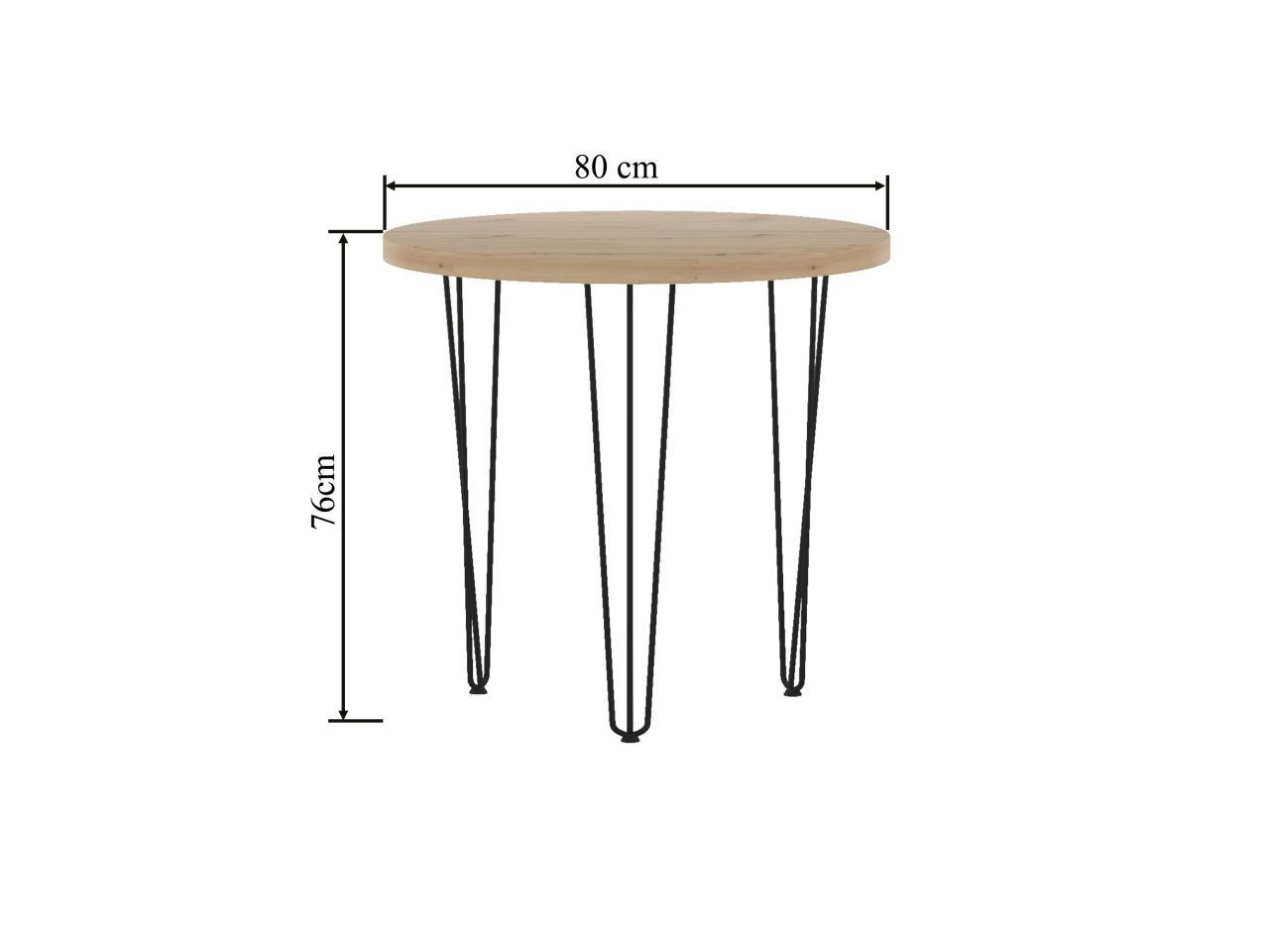 Rozměry: - průměr: 80 cm - výška: 76 cm - tloušťka desky: 3,8 cm Materiál: - deska: laminovaná deska - hrany desky: zakončené ABS plastem - noha: ocel lakovaná práškovou barvou Barva: - dub artisan + černá