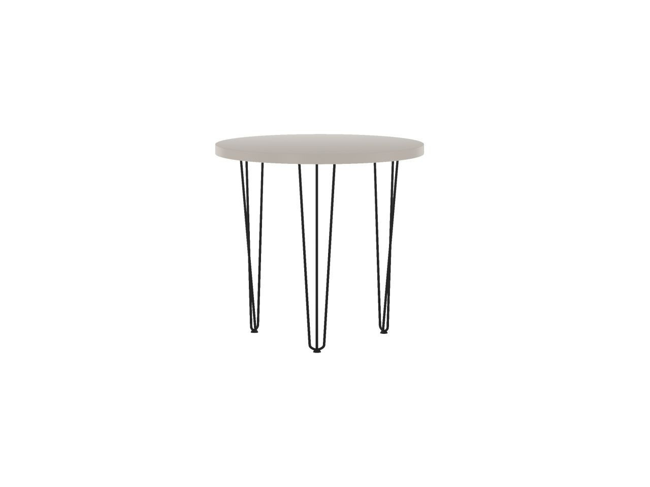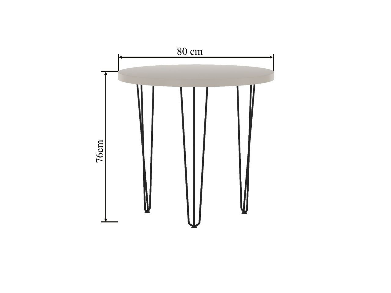 Rozměry: - průměr: 80 cm - výška: 76 cm - tloušťka desky: 3,8 cm Materiál: - deska: laminovaná deska - hrany desky: zakončené ABS plastem - noha: ocel lakovaná práškovou barvou Barva: - kašmír + černá