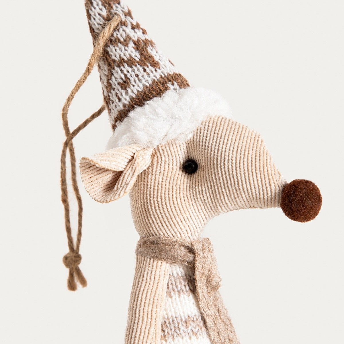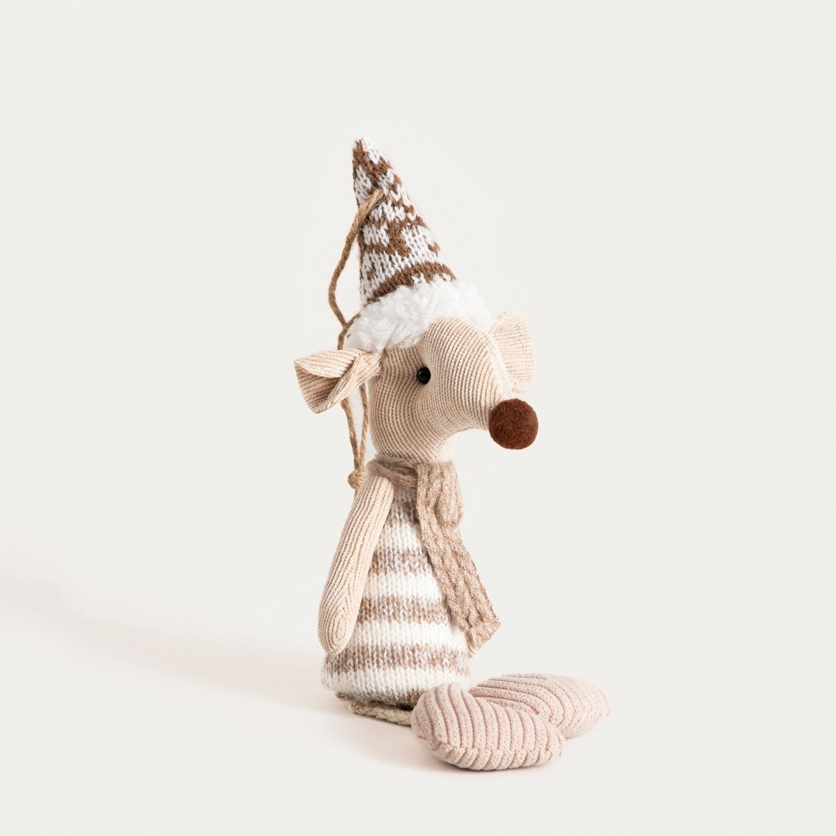 Přívěsek MOUZE je útulná vánoční dekorace, která přinese do vašeho interiéru atmosféru zimní, domácí pohody. Roztomilá myš je oblečena v pleteném pruhovaném svetru v přírodní, tlumené barevné škále béžové a hnědé. Její stylizace je dokončena jemným, pleteným šátkem a vysokým kloboukem. Použití chlupatých a pletených prvků ji činí obzvláště okouzlující a nápadnou.