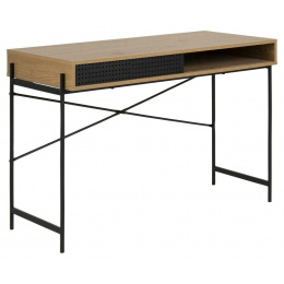Moderní stůl Angus byl vytvořen pro lidi, kteří mají rádi dobrý design zakletý v minimalistickém nábytku. Kompaktní psací stůl s hloubkou 50 cm je ideálním nábytkem pro malou kancelář nebo pokoj pro teenagera. Deska stolu byla vyrobena z MDF desky s dýhou imitující dubové dřevo. Pod blátem byla ukryta polička, kterou zakrývá prolamovaný, posuvný čelní panel vyrobený rovněž z MDF desky. Lehká kovová konstrukce opticky zmenšuje stůl, což způsobuje, že nezaplňuje místnost. Nohy stolu byly vyrobeny z kovu natřeného práškovou barvou na černo. Další, křížící se vzpěry nejsou jen specifickou ozdobou, ale také stabilizují nábytek. Maximální zatížení desky stolu je 30 kg. Rozměry balení: 117x55x10 cm, Hmotnost 18,9 kg