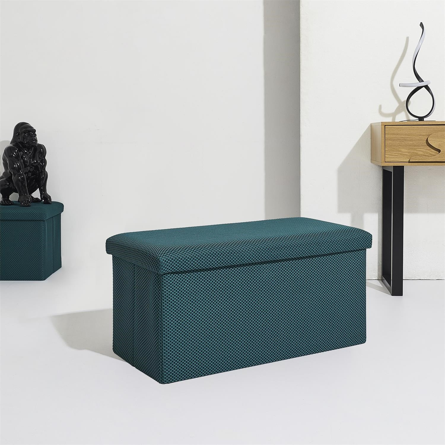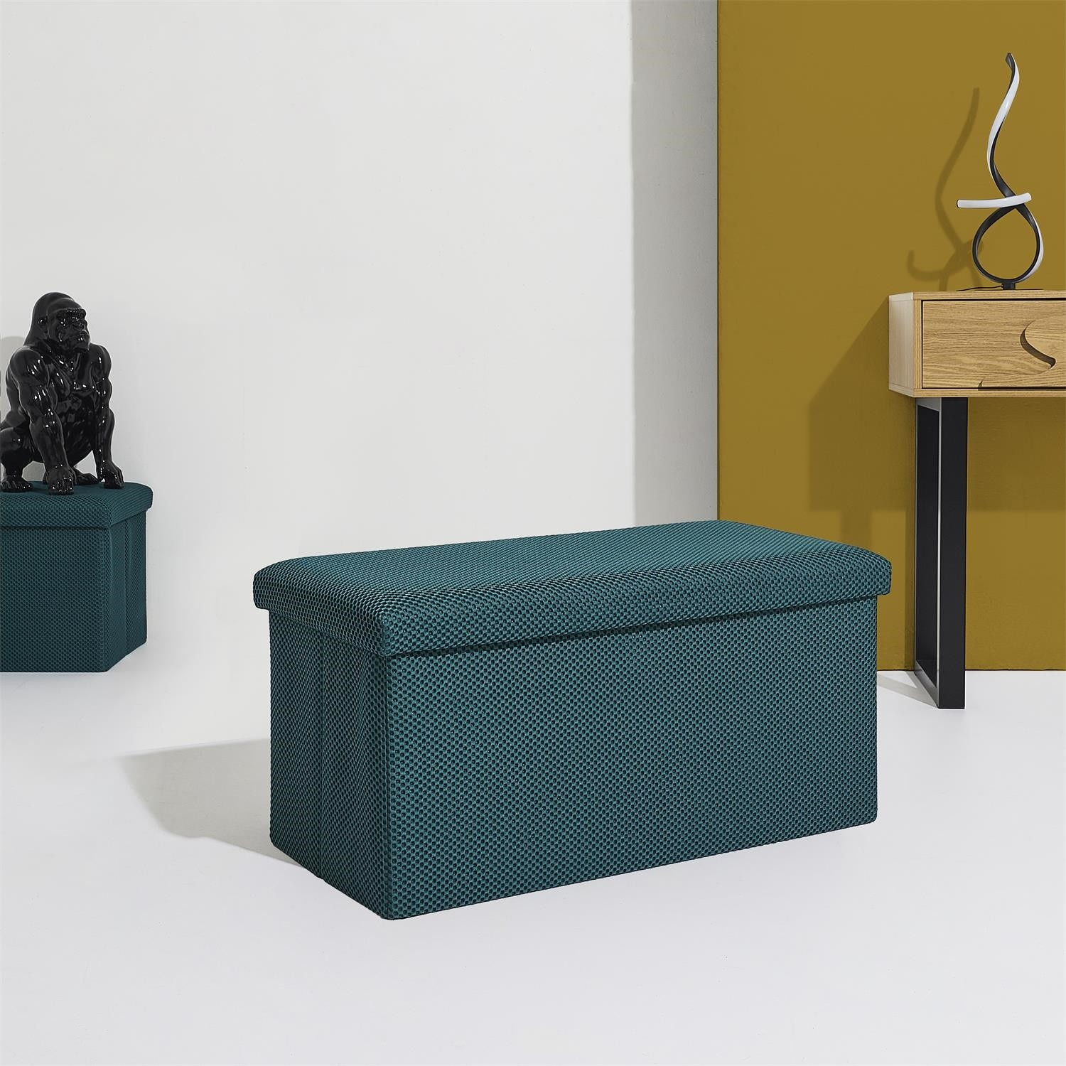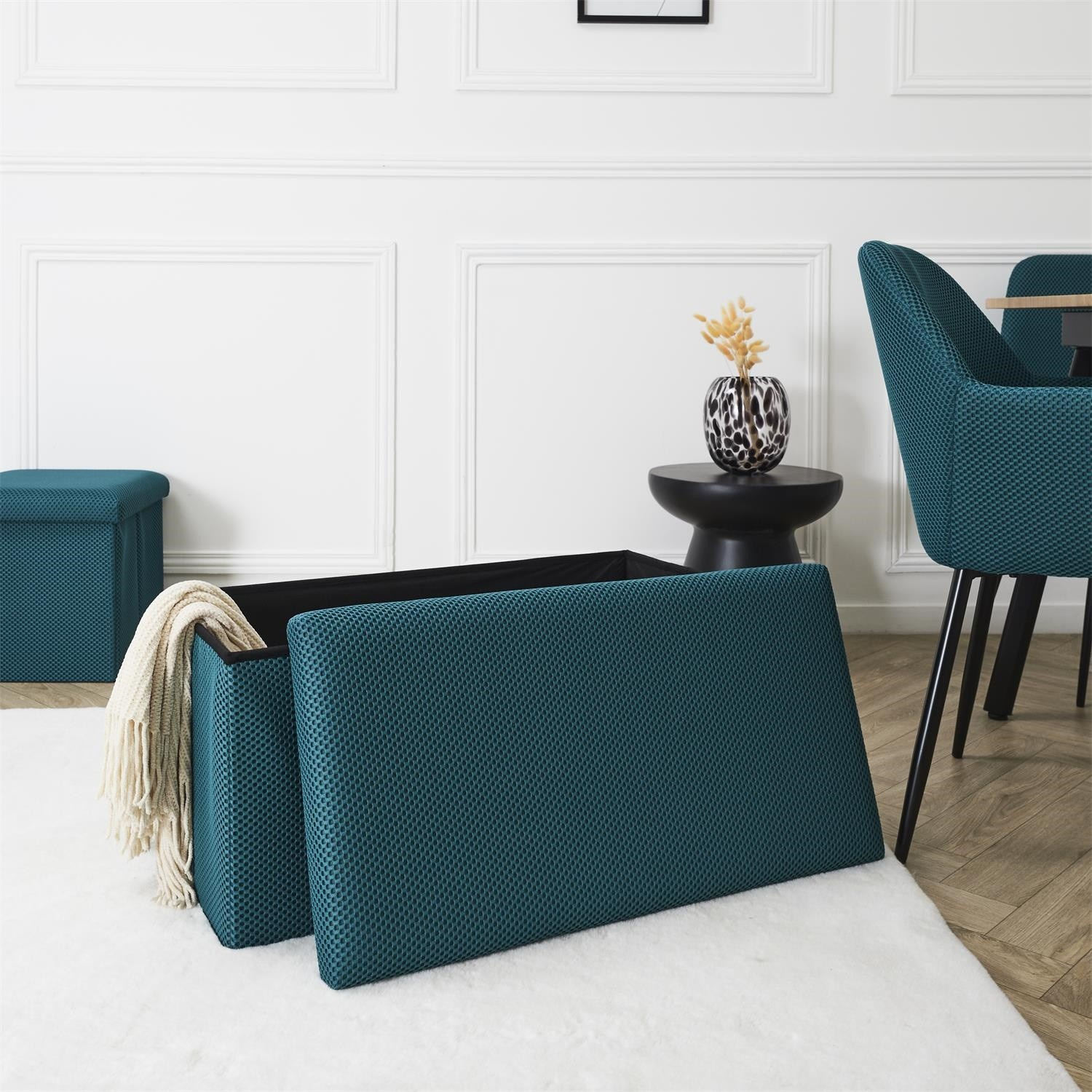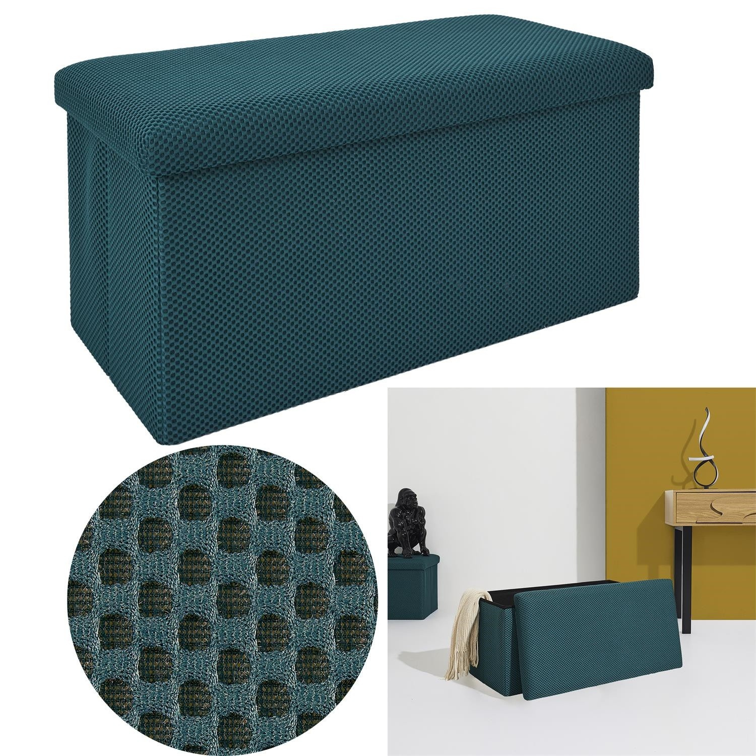 Skládací puf s úložným prostorem je nutností každého studentského bytu nebo pro osoby, které potřebují další místo k sezení a úložný prostor. Puf vyrobený z rámu z odolné MDF desky, která zaručuje maximální přípustné zatížení nábytku až do 110 kg. Puf lze složit, když ji nepoužíváme. Po rozložení nám poskytuje spoustu místa pro uložení jak menších věcí, tak i větších, jako jsou deky, boty nebo knihy. Puf byl ozdoben zajímavou trojrozměrnou tkaninou. Tkanina 100% polyester.