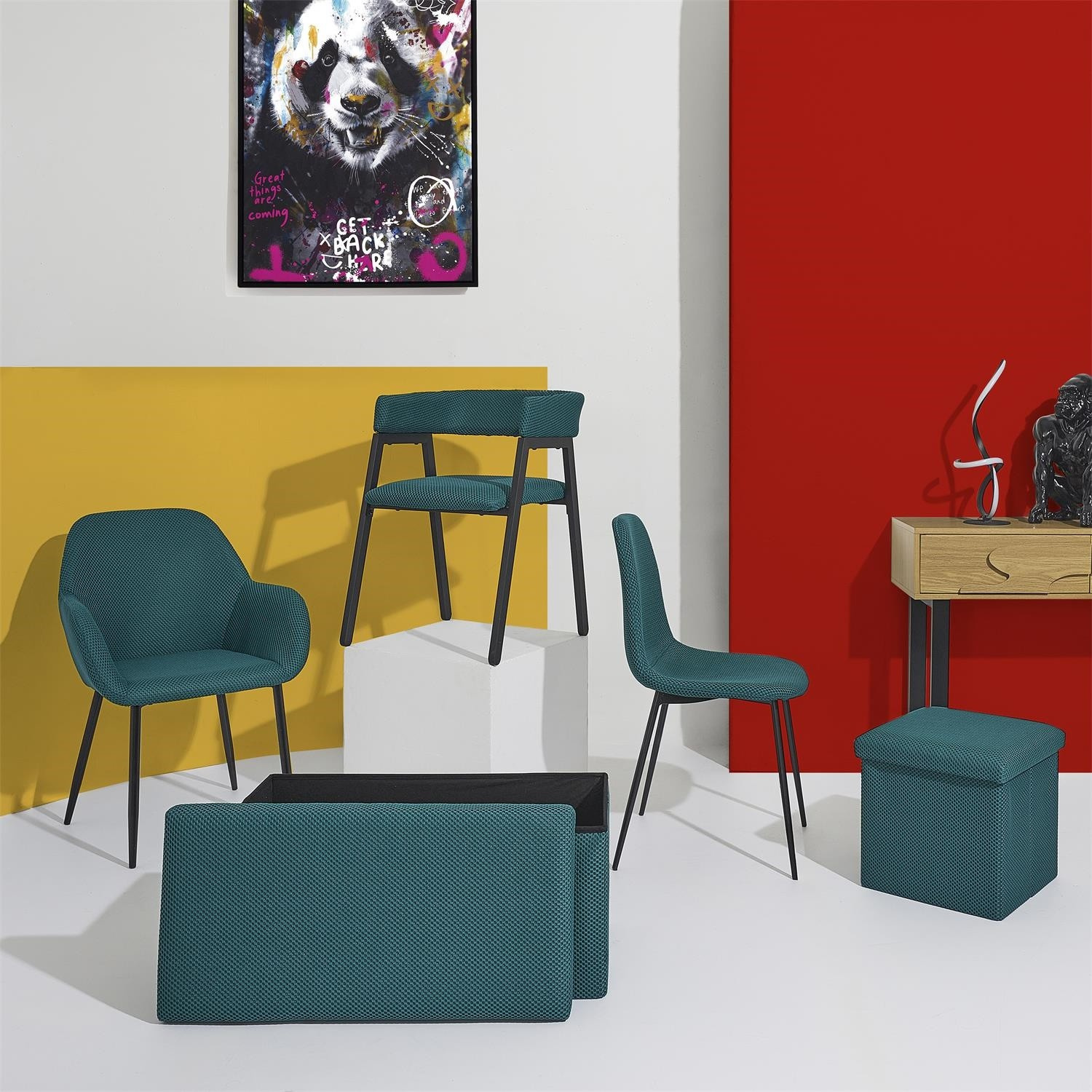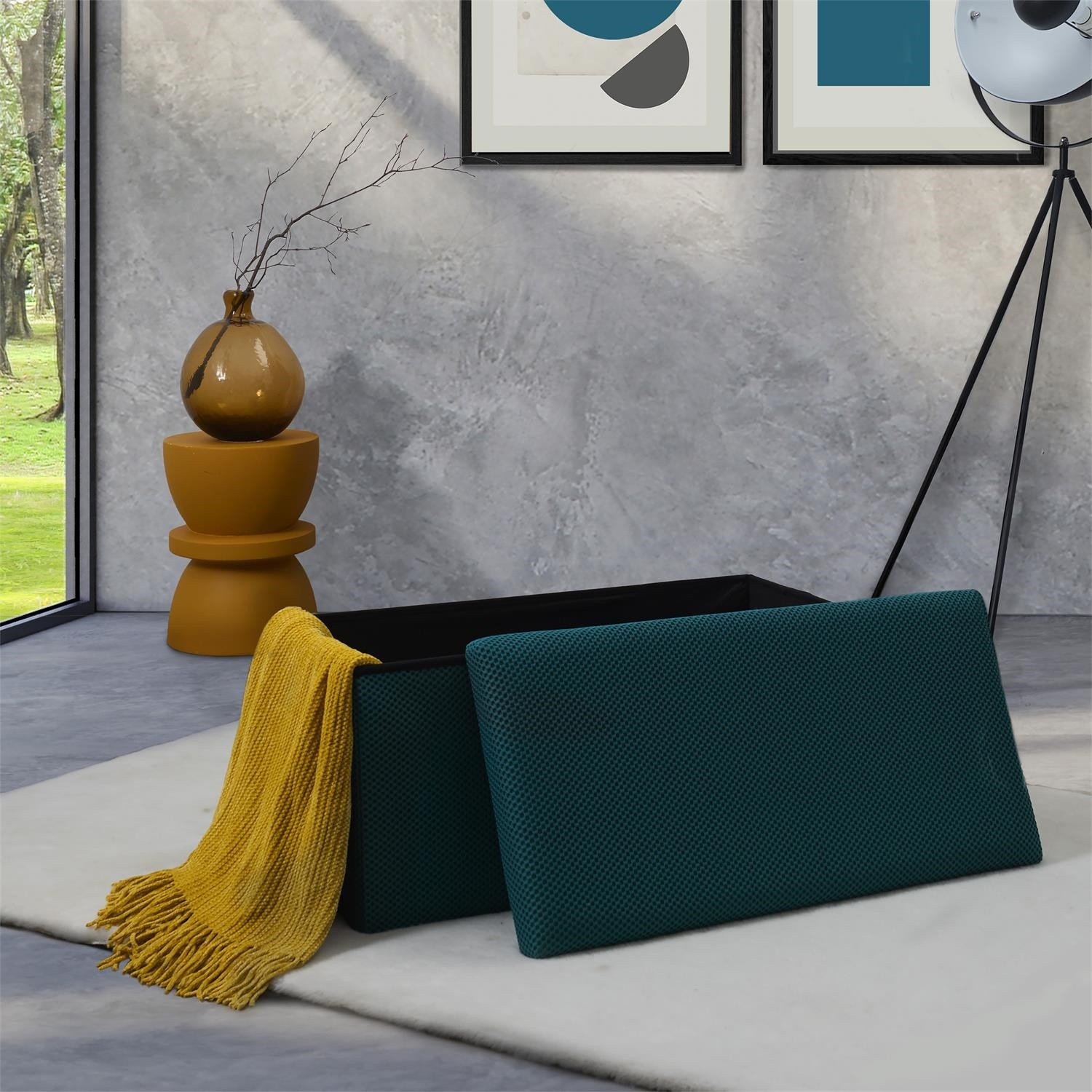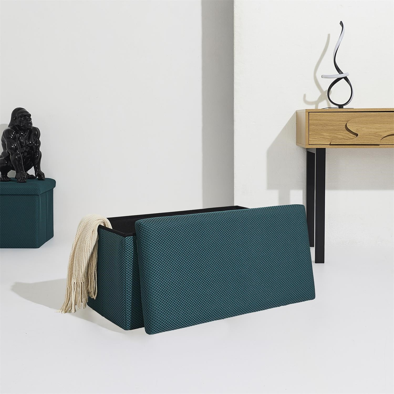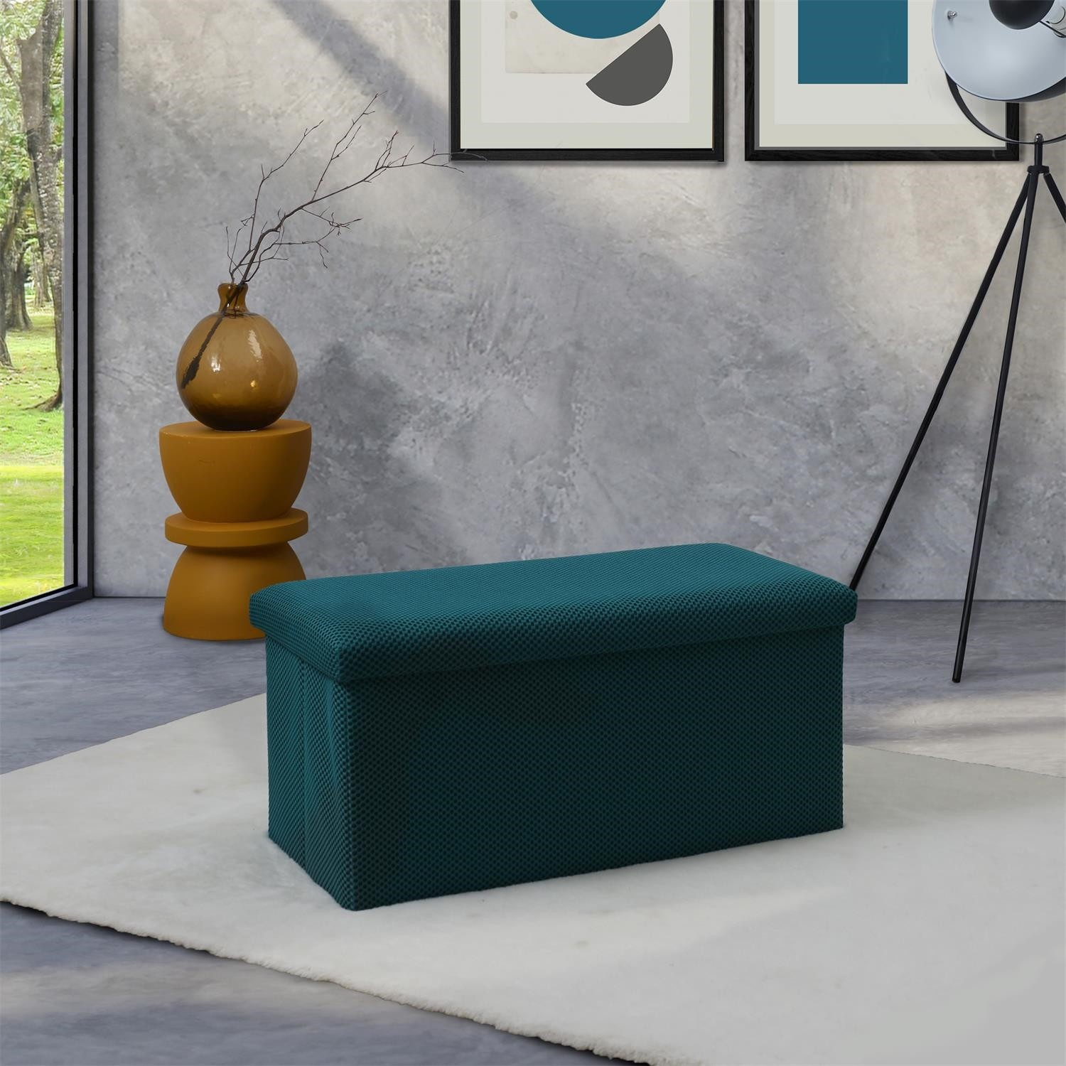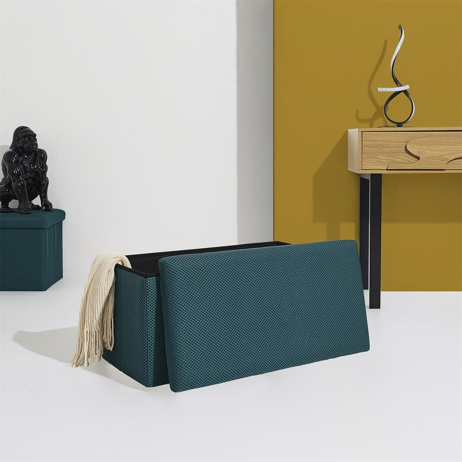 Skládací puf s úložným prostorem je nutností každého studentského bytu nebo pro osoby, které potřebují další místo k sezení a úložný prostor. Puf vyrobený z rámu z odolné MDF desky, která zaručuje maximální přípustné zatížení nábytku až do 110 kg. Puf lze složit, když ji nepoužíváme. Po rozložení nám poskytuje spoustu místa pro uložení jak menších věcí, tak i větších, jako jsou deky, boty nebo knihy. Puf byl ozdoben zajímavou trojrozměrnou tkaninou. Tkanina 100% polyester.