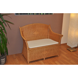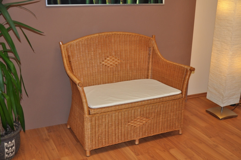 Ratanová lavice vhodná do verandy či šatny. Konstrukce i výplet jsou z přírodního ratanu. Polstr je vyrobený v České republice | Velikost lavice 112x66x90 cm Nosnost 110 kg, barva ratanové konstrukce a výpletu je medová
