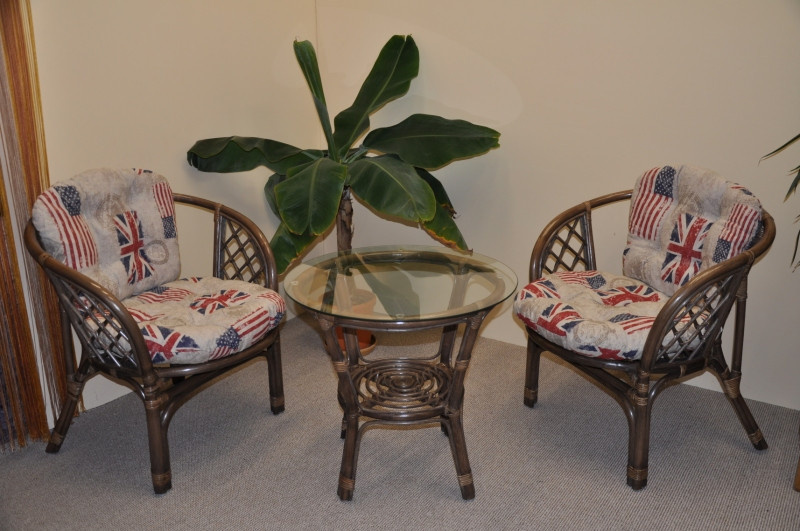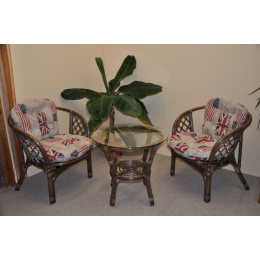 Ratanová sedací souprava Bahama se skládá ze dvou křesel, stolku se skleněnou deskou a kompletní sady polstrů. | Barva ratanové konstrukce je hnědá. Materiál konstrukce je přírodní ratan. Velikost křesla bahama je 68x66x73 cm, výška sedu 44 cm, nosnost křesla je 110 kg. Stolek má výšku 55 cm, průměr stolku 60 cm. Spoje ratanové konstrukce jsou šroubovány. Polstry jsou vyrobeny v České republice a lze je prát ručně na 40oC nebo čistit v čistirně.