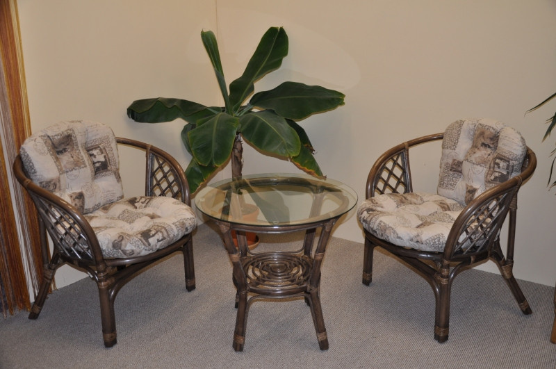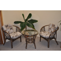 Ratanová sedací souprava Bahama se skládá ze dvou křesel, stolku se skleněnou deskou a kompletní sady polstrů. | Barva ratanové konstrukce je hnědá. Materiál konstrukce je přírodní ratan. Velikost křesla bahama je 68x66x73 cm, výška sedu 44 cm, nosnost křesla je 110 kg. Stolek má výšku 55 cm, průměr stolku 60 cm. Spoje ratanové konstrukce jsou šroubovány. Polstry jsou vyrobeny v České republice a lze je prát ručně na 40oC nebo čistit v čistirně.