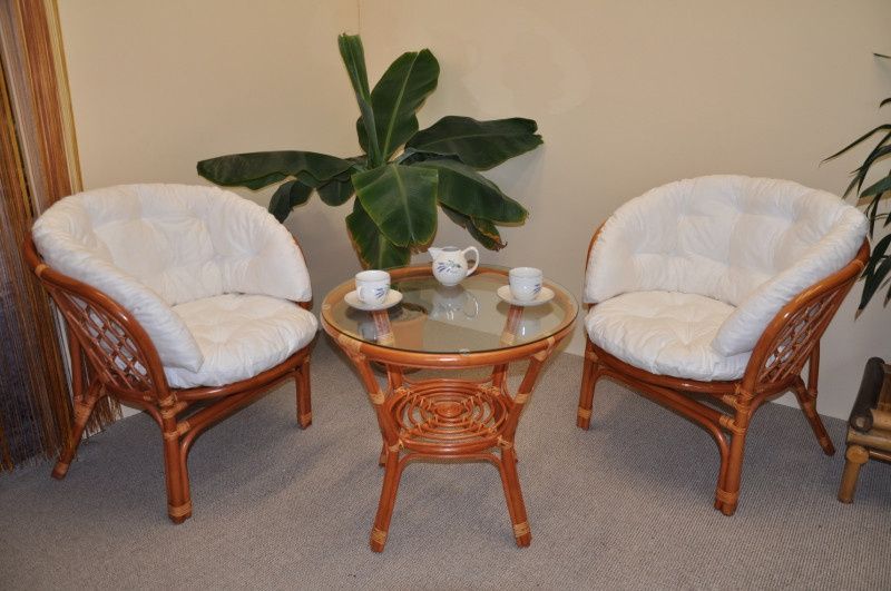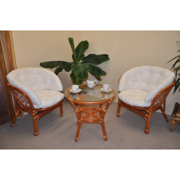 Ratanová sedací souprava Bahama se skládá ze dvou křesel, stolku se skleněnou deskou a kompletní sady polstrů v MAXI provedení. | Barva ratanové konstrukce je koňak. Materiál konstrukce je přírodní ratan. Velikost křesla bahama je 68x66x73 cm, výška sedu 44 cm, nosnost křesla je 110 kg. Stolek má výšku 55 cm, průměr stolku 60 cm. Spoje ratanové konstrukce jsou šroubovány. Polstry na tuto sedací soupravu Bahama jsou vyrobeny v České republice. Polstry jsou vyrobeny z kvalitní látky a vyznačují se vysokou kvalitou zpracování.Polstry pro nás vyrábí firma AXIN Cuschions s.r.o., která zaměstnávávýhradně místní vyučené švadleny z České republiky. Tímto způsobem sesnažíme podporovat výrobu a zaměstnanost v naší republice. Náplň polstrů je drcený molitan a polstry lze prát ručně na 40o C