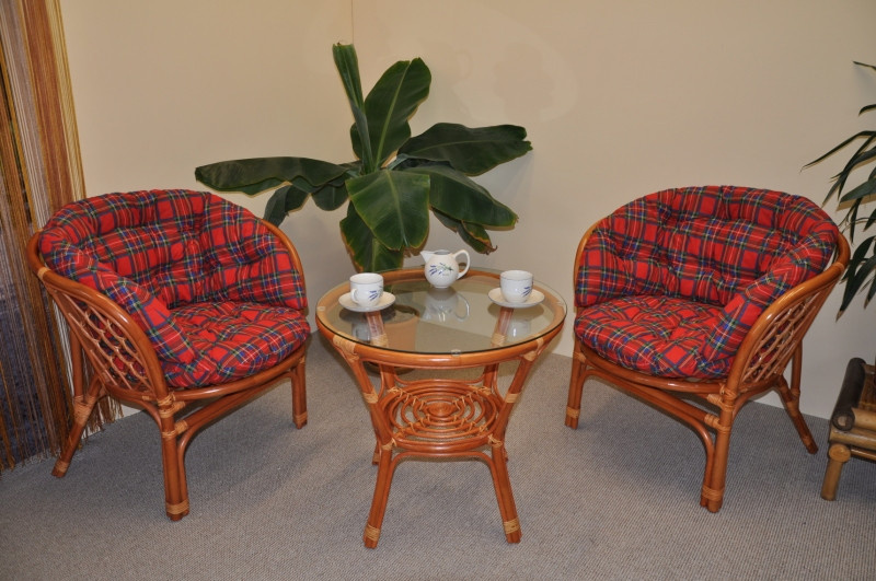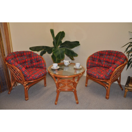 Ratanová sedací souprava Bahama se skládá ze dvou křesel, stolku se skleněnou deskou a kompletní sady polstrů v MAXI provedení. | Barva ratanové konstrukce je koňak. Materiál konstrukce je přírodní ratan. Velikost křesla bahama je 68x66x73 cm, výška sedu 44 cm, nosnost křesla je 110 kg. Stolek má výšku 55 cm, průměr stolku 60 cm. Spoje ratanové konstrukce jsou šroubovány. Polstry jsou vyrobeny v České republice a lze je prát ručně na 40oC nebo čistit v čistirně.
