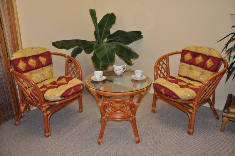 Sedací souprava Bahama patří stále mezi nejoblíbenější ratanové sedací soupravy. Souprava se skládá ze dvou křesel, stolku se skleněnou deskou a kompletní sady polstrů. | Barva ratanové konstrukce je koňak. Materiál konstrukce je přírodní ratan. Rozměr křesla je 68x66x73 cm, výška sedu 44 cm, nosnost křesla je 110 kg. Stolek má výšku 55 cm, průměr stolku 60 cm. Spoje ratanové konstrukce jsou šroubovány. Polstry jsou vyrobeny v České republice a lze je prát ručně na 40oC nebo čistit v čistirně.