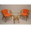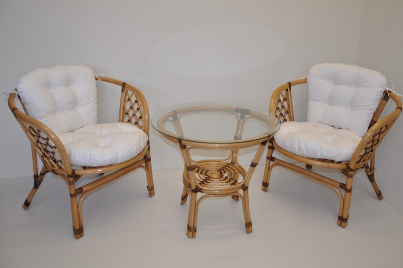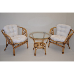 Sedací souprava Bahama patří stále mezi nejoblíbenější ratanové sedací soupravy. Souprava se skládá ze dvou křesel, stolku se skleněnou deskou a kompletní sady polstrů. | Přinášíme Vám oblíbenou sedací soupravu v nevšedním provedení, které dodá sedací soupravě Bahama zcela unikátní vzhled. Barva ratanové konstrukce je medová. Opletení spojů konstrukce je v hnědé barvě. Materiál konstrukce je přírodní ratan. Rozměr křesla je 68x66x73 cm, výška sedu 44 cm, nosnost křesla je 110 kg. Stolek má výšku 55 cm, průměr stolku 70 cm. Spoje ratanové konstrukce jsou šroubovány. Polstry na tuto sedací soupravu jsou vyrobeny v České republice. Polstry jsouvyrobeny z kvalitní látky a vyznačují se vysokou kvalitou zpracování.Polstry pro nás vyrábí firma AXIN Cuschions s.r.o., která zaměstnávávýhradně místní vyučené švadleny z České republiky. Tímto způsobem sesnažíme podporovat výrobu a zaměstnanost v naší republice. Náplň polstrů je drcený molitan a polstry lze prát ručně na 40o C.