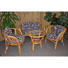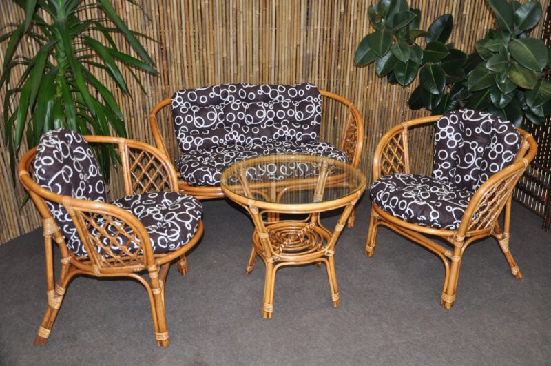 Ratanový nábytek - ratanová sedací souprava je vyrobena z přírodního ratanu s barvou konstrukce odpovádající fotografii výrobku,obsahuje lavici,2 křesla a stolek se sklem, kompletní sadu polstrů vyrobených v České republice | Barva ratanové konstrukce je brown wash - medová s vymývanou hnědou, díky čemuž získává souprava originální design zvláště oblíbený v Asii. Spoje ratanové konstrukce jsou šroubovány. Rozměr lavice 115x66x73 cm, nosnost lavice 150 kg Rozměr křesla 68x66x73 cm, nosnost křesla 110 kg Stolek výška 55 cm, průměr stolku 60 cm Polstry lze prát ručně na 40oC nebo čistit v čistírně