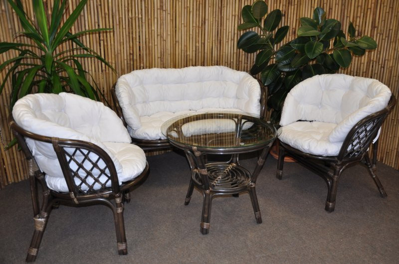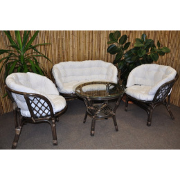Ratanový nábytek - ratanová sedací souprava je vyrobena z přírodního ratanu s barvou konstrukce odpovádající fotografii výrobku,obsahuje lavici,2 křesla a stolek se sklem, kompletní sadu polstrů vyrobených v České republice | Barva ratanové konstrukce je hnědá, spoje ratanové konstrukce jsou šroubovány. Rozměr lavice 115x66x73 cm, rozměr křesla 68x66x73 cm, stolek výška 55 cm, průměr stolku 60 cm,nosnost lavice 150 kg, nosnost křesla 110 kg, Polstry lze prát ručně na 40oC nebo čistit v čistírně