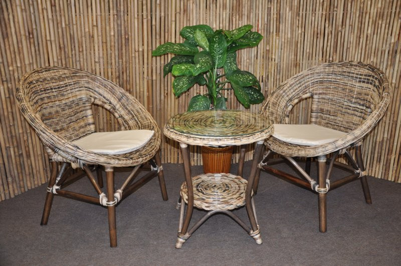 Zajímavě řešená ratanová sedací souprava sestávající se ze dvou pohodlných křesel s polstry vyrobenými v České republice. Součástí soupravy je stolek se skleněnou deskou. Spoje ratanové konstrukce jsou šroubovány. | Barva ratanové konstrukce je hnědá, zapletené proutky tvoří originální barevnou mozaiku díky barvení ještě před zapletením. Velikost křesla 73x65x80 cm, nosnost 110 kg. Stolek se skleněnou deskou má průměr 50 cm. Výška stolku je 50 cm.