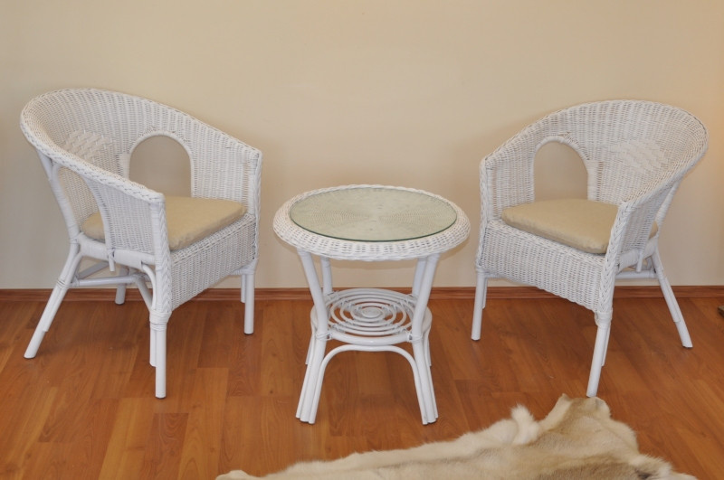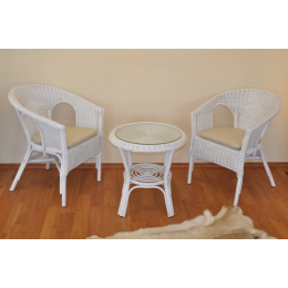 Ratanový nábytek - ratanová sedací souprava je vyrobena z přírodního ratanu v bílé barvě konstrukce. | Souprava obsahuje 2 křesla a stolek se sklem, kompletní sadu polstrů dle obrázku Masivní ratanová konstrukce s ratanovým výpletem z proutků průměr 3 mm. Barva ratanové konstrukce i výpletu je bílá. Rozměr křesla je 58x57x76 cm, nosnost křesla 110 kg Stolek se sklem průměr 50 cm, výška stolku je 55 cm Polstry jsou vyrobeny v České republice. Spoje ratanové konstrukce jsou šroubovány.