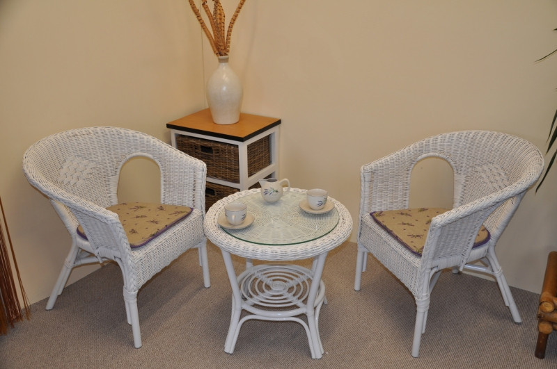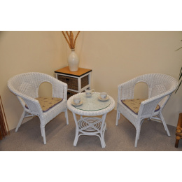 Ratanový nábytek - ratanová sedací souprava je vyrobena z přírodního ratanu v bílé barvě konstrukce. | Souprava obsahuje 2 křesla a stolek se sklem, kompletní sadu polstrů dle obrázku Masivní ratanová konstrukce s ratanovým výpletem z proutků průměr 3 mm. Barva ratanové konstrukce i výpletu je bílá. Rozměr křesla je 58x57x76 cm, nosnost křesla 110 kg Stolek se sklem průměr 50 cm, výška stolku je 55 cm Polstry jsou vyrobeny v České republice. Spoje ratanové konstrukce jsou šroubovány.