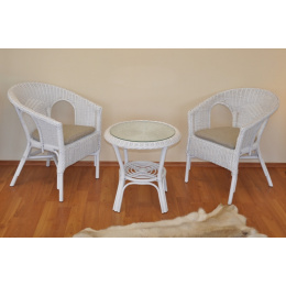 Ratanový nábytek - ratanová sedací souprava je vyrobena z přírodního ratanu v bílé barvě konstrukce. | Souprava obsahuje 2 křesla a stolek se sklem, kompletní sadu polstrů dle obrázku Masivní ratanová konstrukce s ratanovým výpletem z proutků průměr 3 mm. Barva ratanové konstrukce i výpletu je bílá. Rozměr křesla je 58x57x76 cm, nosnost křesla 110 kg Stolek se sklem průměr 50 cm, výška stolku je 55 cm Polstry jsou vyrobeny v České republice. Spoje ratanové konstrukce jsou šroubovány.
