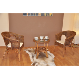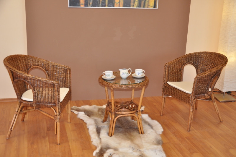 Ratanový nábytek - ratanová sedací souprava je vyrobena z přírodního ratanu s barvou konstrukce odpovádající fotografii výrobku. Souprava obsahuje 2 křesla a stolek se sklem, kompletní sadu polstrů dle obrázku | Masivní ratanová konstrukce s ratanovým výpletem z proutků průměr 3 mm. Barva ratanové konstrukce i výpletu je brown wash, medová s vymývanou hnědou. Rozměr křesla je 58x57x76 cm, nosnost křesla 110 kg Stolek se sklem průměr 50 cm, výška stolku je 55 cm Polstry jsou vyrobeny v České republice.