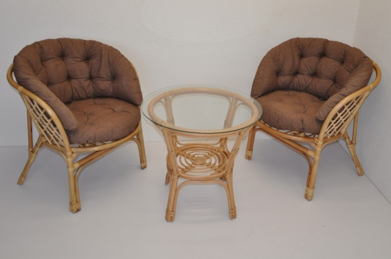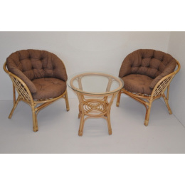 Poslední kus!!! Ratanová sedací souprava Jawa vychází konstrukčně z velice oblíbené sedací soupravy Bahama. Sedací soupravu prodáváme jako celek 2 křesílka, stolek se sklem a sadu polstrů. | Sedací souprava je vyrobena z přírodního ratanu. Barva ratanové konstrukce i výpletu je medová. Velikost křesla 67x65x72 cm, nosnost křesla je 110 kg, výška sedu je 42 cm. Průměr skleněné desky stolku je 60 cm, výška stolku je 56 cm. Polstry jsou vyrobeny v České republice.