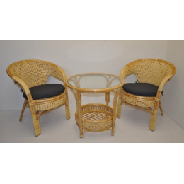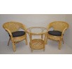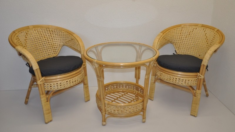 Ratanový nábytek - ratanová sedací souprava je vyrobena z přírodního ratanu s barvou konstrukce odpovádající fotografii výrobku,obsahuje 2 křesla a stolek se sklem a sadu polstrů. | Barva ratanové konstrukce i ratanového výpletu je medová. Velikost křesla je 66x67x78 cm. Nosnost křesla 115kg. Stolek výška 60 cm, průměr stolku 65 cm. Spoje ratanové konstrukce jsou šroubovány. Polstry jsou vyrobeny v České republice.