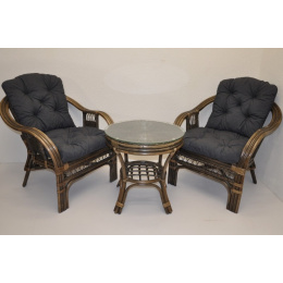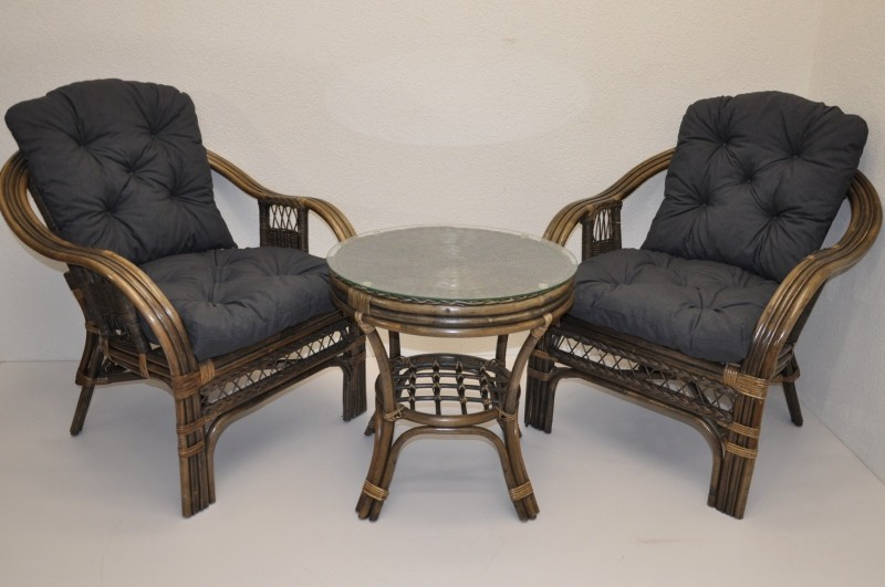 Ratanová sedací souprava je vyrobena z přírodního ratanu z masivních ratanových tyčí. Součástí soupravy jsou 2 křesla, stolek a sada polstrů. | Konstrukce ratanové sedací soupravy je na většině míst trojitá a tím velice pevná. Křesla jsou velice pohodlná díky rozložitému tvaru a kvalitním polštářům. Barva ratanové kontrukce a výpletu je hnědá. Velikost křesla je 68x75x74 cm, nosnost křesla je 125 kg. Výška sedu je 44 cm. Stolek má průměr 55 cm a je 55 cm vysoký.