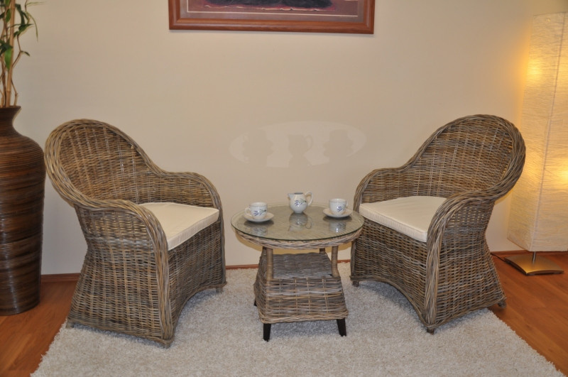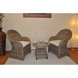 Nádherná ratanová sedací souprava vyrobená z přírodního ratanu s výpletem z ratanu kubu v šedé barvě. Souprava se skládá ze 2 pohodlných křesel s polstry a stolku se skleněnou deskou. | Materiál konstrukce je přírodní ratan kubu v přírodní šedé barvě. Materiál výpletu je ratan kubu v přírodní šedé barvě. Ratan kubu se vyznačuje velkou pevností a odolností. Křeslo má díky tomu velice pevnou konstrukci Velikost křesla je 64x63x85 cm, nosnost křesla je 125 kg Velikost stolku je: průměr 60 cm, výška 50 cm Momentálně křesla nabízíme s polstrem v hnědobéžové barvě, která je zachycena na druhé fotografii.