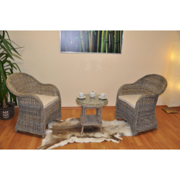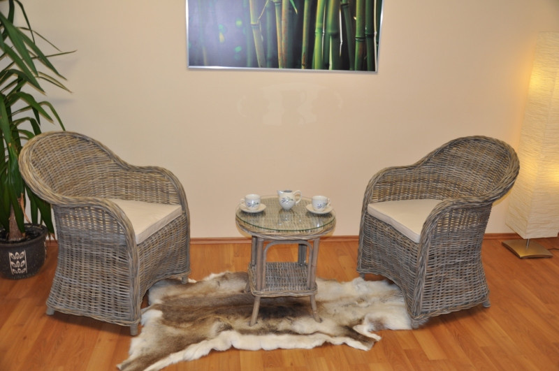 Nádherná ratanová sedací souprava vyrobená z přírodního ratanu s výpletem z ratanu kubu v šedé barvě. Souprava se skládá ze 2 pohodlných křesel s polstry a stolku se skleněnou deskou. | Materiál konstrukce je přírodní ratan kubu v přírodní šedé barvě. Materiál výpletu je ratan kubu v přírodní šedé barvě. Ratan kubu se vyznačuje velkou pevností a odolností. Křeslo má díky tomu velice pevnou konstrukci Velikost křesla je 64x63x85 cm, nosnost křesla je 125 kg Velikost stolku je: průměr 50 cm, výška 55 cm Momentálně křesla nabízíme s polstrem v hnědobéžové barvě, která je zachycena na druhé fotografii.