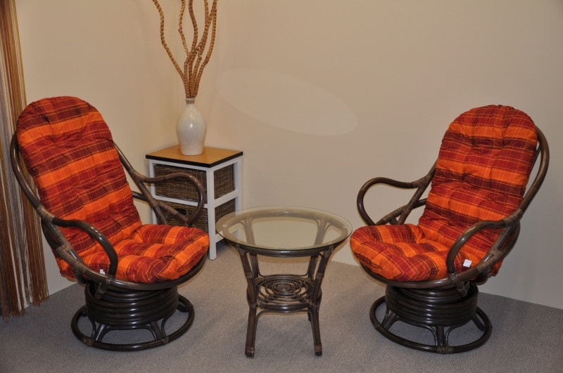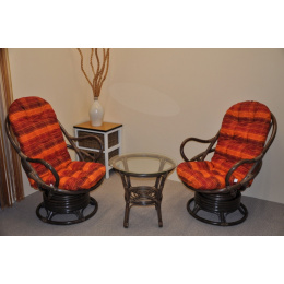 Ratanová sedací souprava se skládá ze dvou křesel Swivel s polstry a stolu se skleněnou deskou. | Barva ratanové konstrukce je hnědá. Velikost ratanového křesla Swivel je 77x87x95 cm, nosnost je 110kg. Kovový díl se čtyřmi pružinami zajišťuje pohodlné houpání a možnost otáčení křesla o 360 stupňů. Houpání a otáčení je možné provádět současně. Křesla dodáváme v částečně demontovaném stavu pro snadnější přepravu. Stolek se sklem je 55 cm vysoký a jeho průměr je 60 cm. Polstry jsou vyrobeny v České republice a jsou pratelné na 40oC. Další varianty polstrování naleznete pod variantami této soupravy v kategorii sedací soupravy malé nebo nás neváhejte kontaktovat.