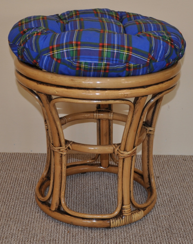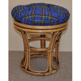 Ratanový nábytek - ratanová taburetka s polstrem. | Barva ratanové konstrukce je brown wash. Taburetka je nejprve lakována do medové barvy. Po zaschnutí medové barvy je taburetka lakována do batvy hnědé, která je ještě před zaschnutím otřena a zůstane tak jen na určitých místech, jako záhyby a křížění konstrukce. Průměr taburetky je 40 cm. Výška ratanové konstrukce taburetky je 40 cm. Nosnost ratanové taburetky je 110 kg. Kvalitní polstr je vyrobený v České republice.