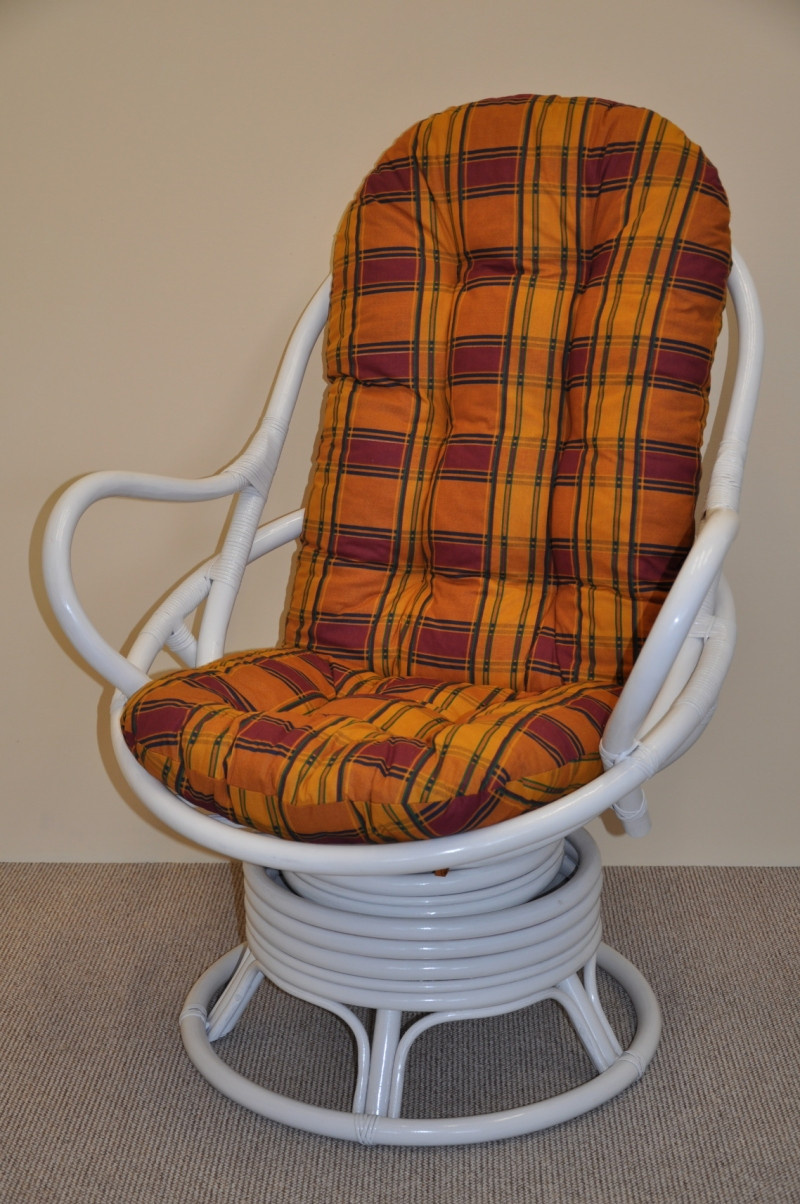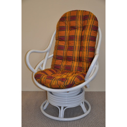 Ratanové houpací křeslo je vyrobeno z přírodního ratanu v barevném provedení konstrukce bílé a polstru dle obrázku. | Velikost ratanového křesla je 77x87x95 cm, nosnost 110kg. Barva ratanové konstrukce je bílá Kovový díl se čtyřmi pružinami zajišťuje pohodlné houpání a možnost otáčení křesla o 360 stupňů. Polstr je vyrobený v České republice a je pratelný na 40oC.