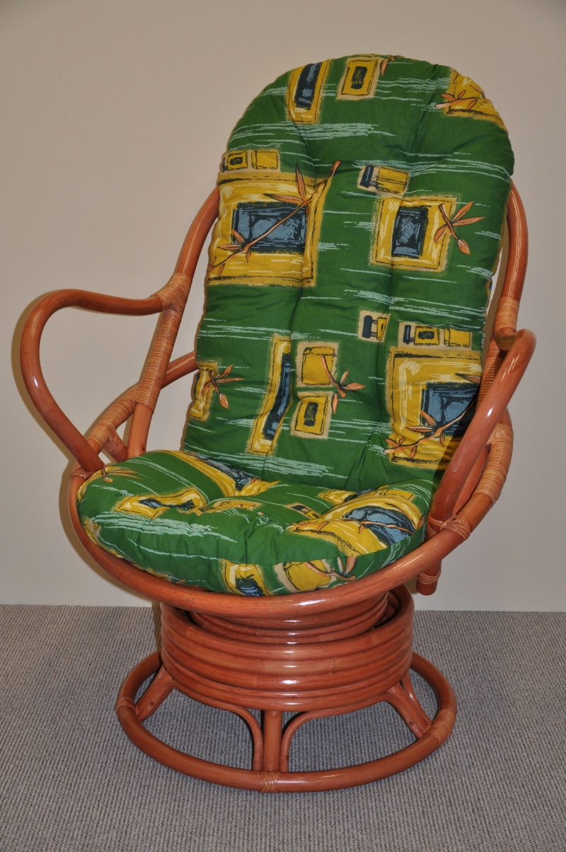 Ratanové houpací křeslo je vyrobeno z přírodního ratanu v barevném provedení konstrukce koňak a polstru dle obrázku. | Velikost ratanového křesla je 77x87x95 cm, nosnost 110kg. Barva ratanové konstrukce je koňak Kovový díl se čtyřmi pružinami zajišťuje pohodlné houpání a možnost otáčení křesla o 360 stupňů. Polstr je vyrobený v České republice a je pratelný na 40oC.