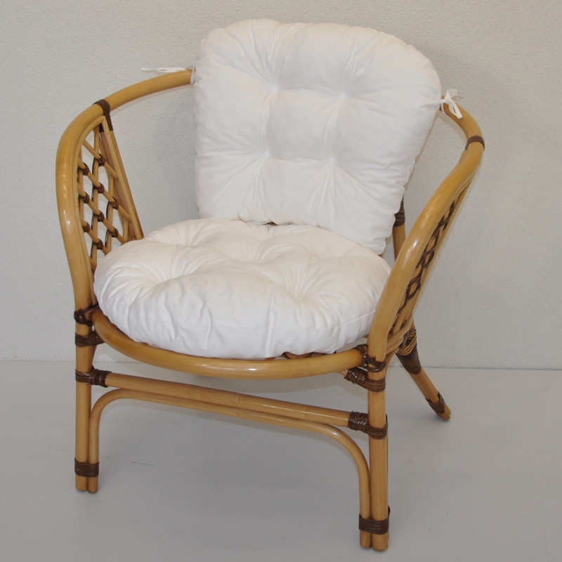 Ratanový nábytek - ratanové křeslo bahama samostatné s polstrem dle obrázku. | Barva ratanové konstrukce křesla je medová doplněna ratanovým dekorem v hnědé barvě. Nosnost křesla je 110 kg. Velikost křesla je 68x66x73 cm. Výška sedu je příjemných 43 cm. Kvalitní polstr je vyrobený v ČESKÉ REPUBLICE