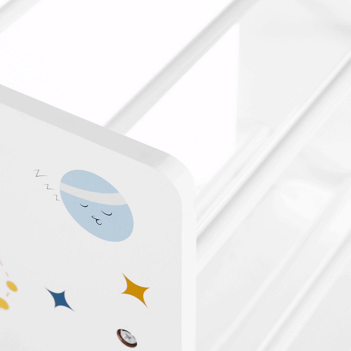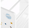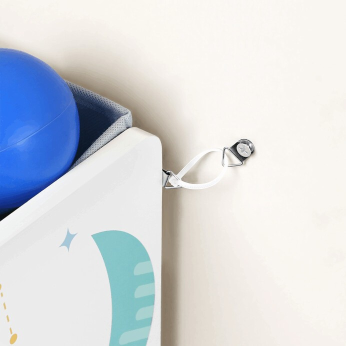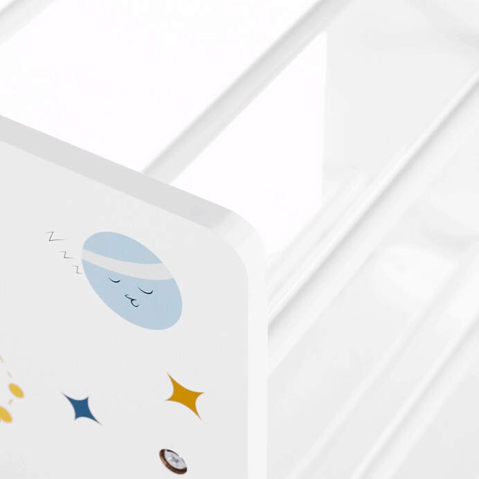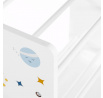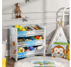 Regál na hračky s devíti látkovými boxy nabízí praktické a přehledné uspořádání dětských věcí. Bílé bočnice jsou zdobené barevným motivem vesmíru, který zaujme malé i větší děti a podpoří jejich představivost. Boxy v odstínech šedé a modré jsou snadno vyjímatelné a opatřené úchyty pro pohodlnou manipulaci. Kompaktní rozměry regálu umožňují jeho umístění do dětského pokoje či herny, kde pomůže udržet pořádek a zároveň přinese hravý designový prvek.