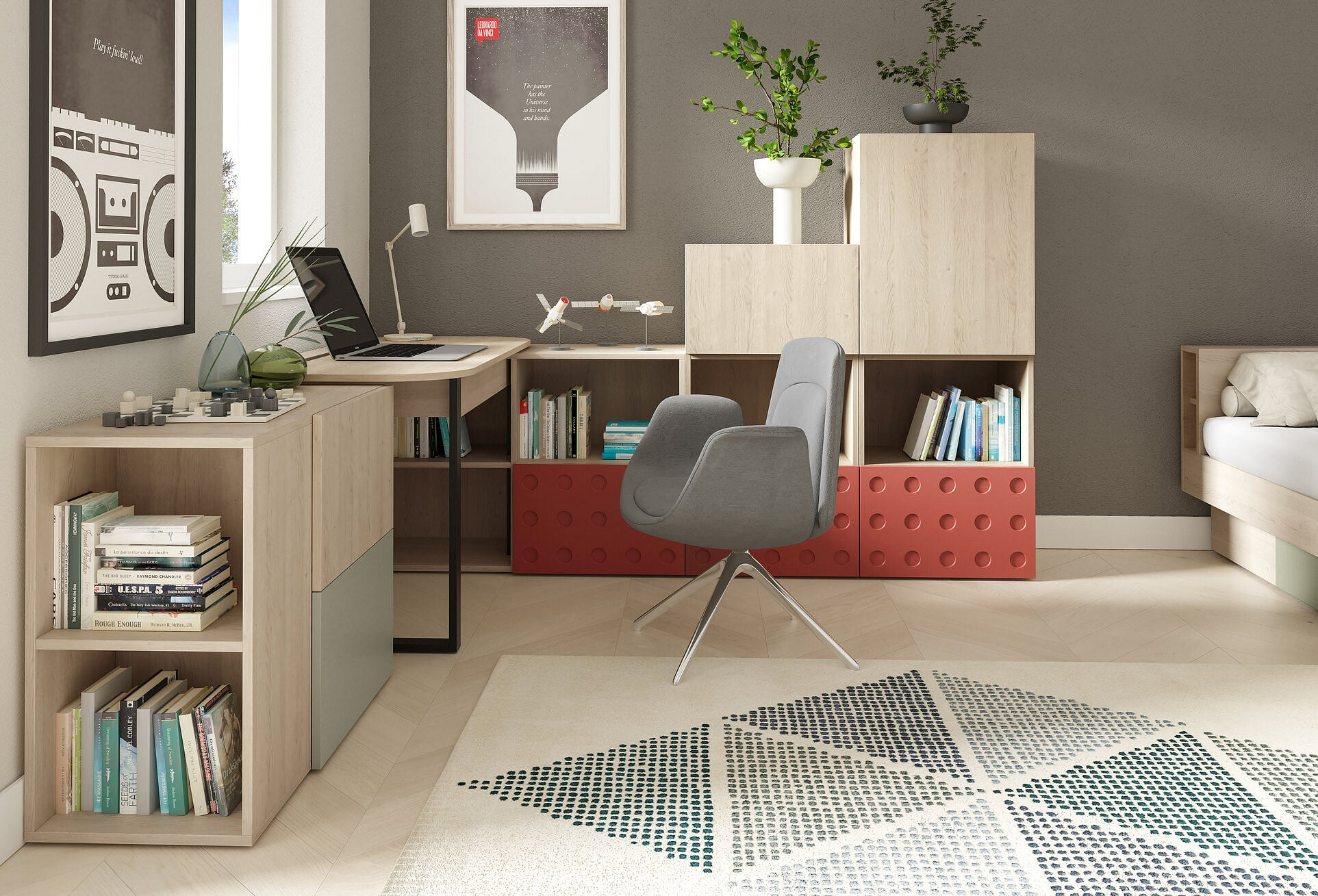 Systém SALSA je vyroben v barevném provedení - Dub piškotový/Eukalyptus/Salsa.