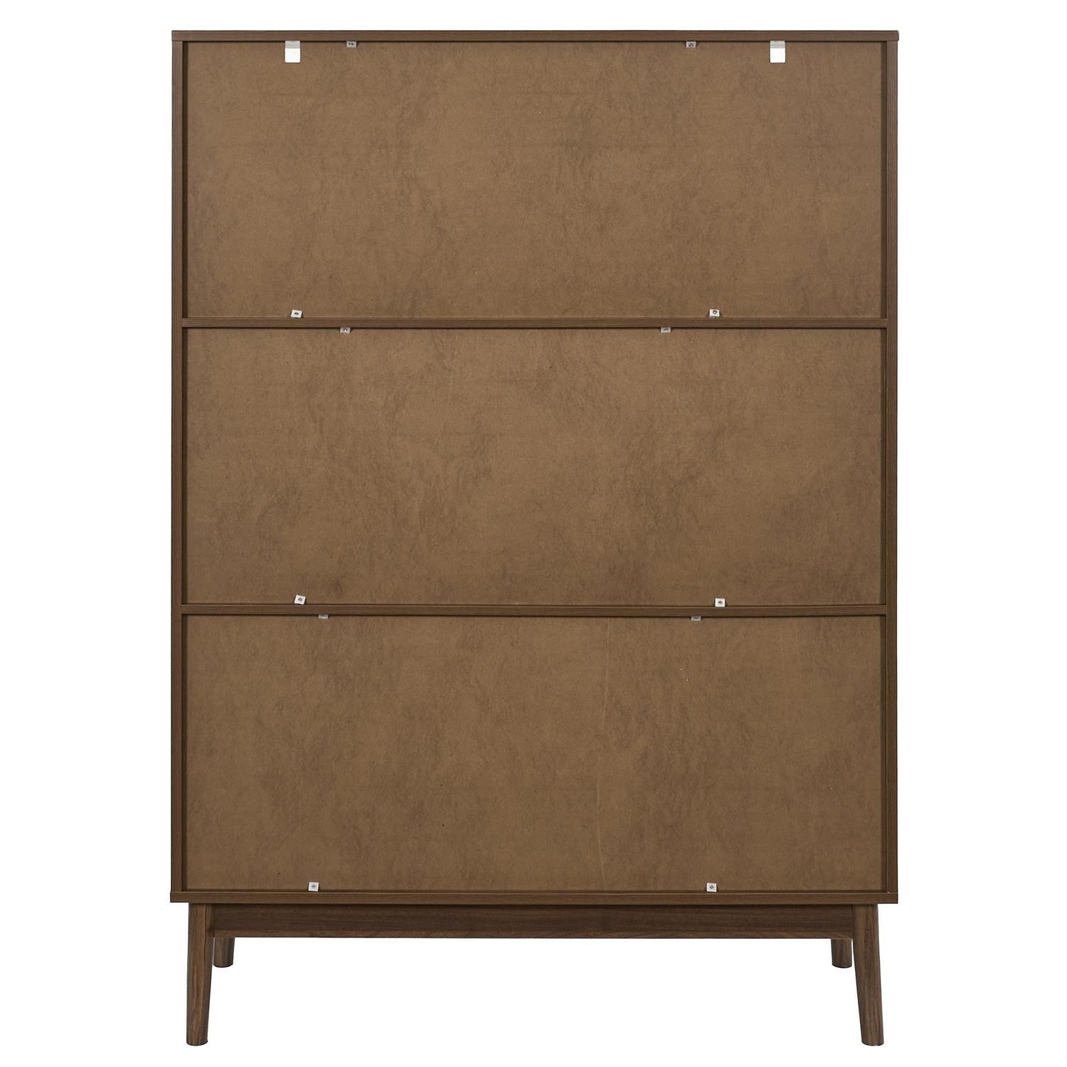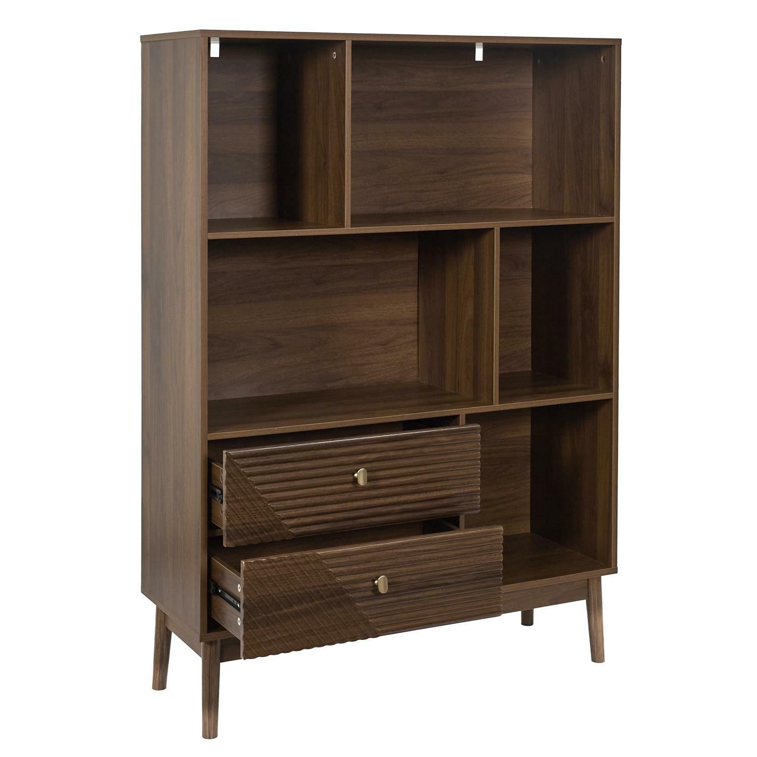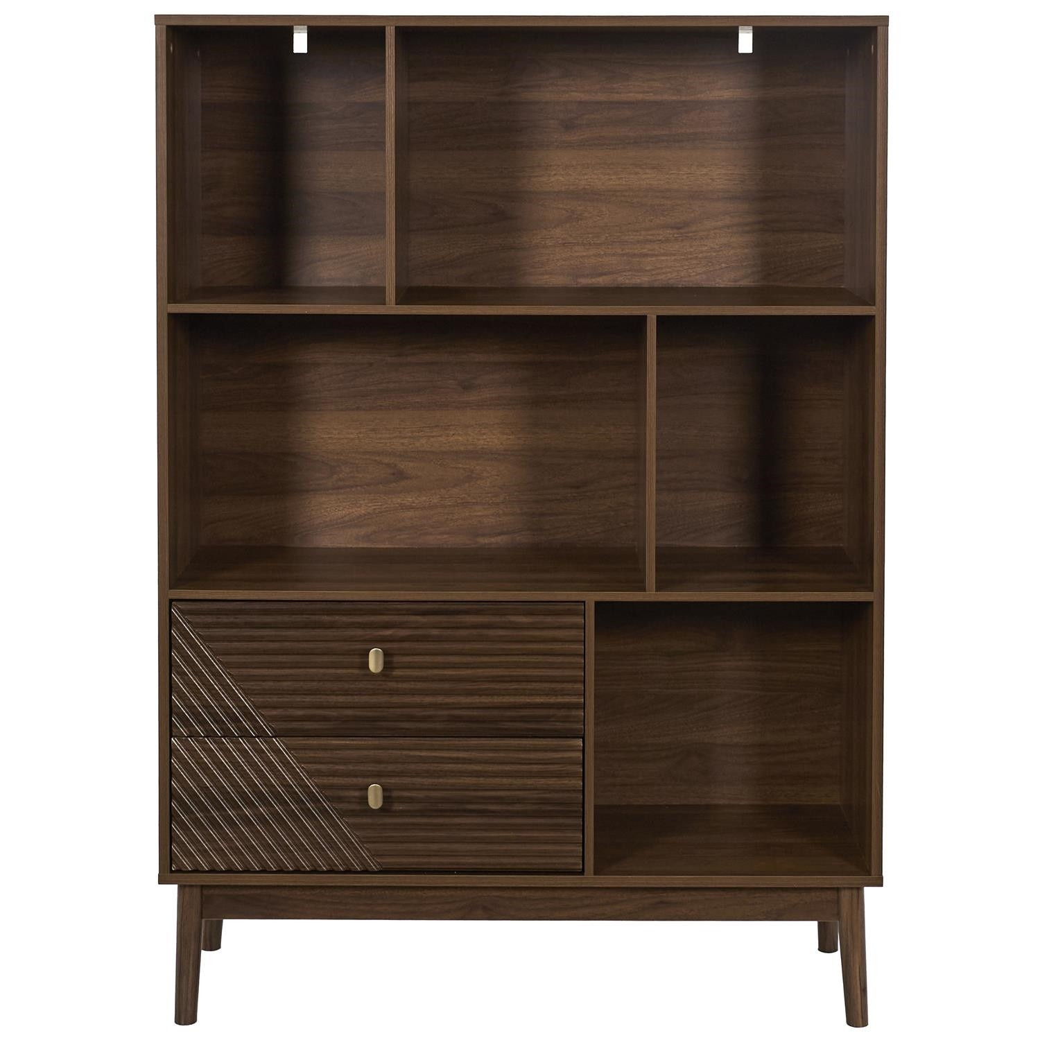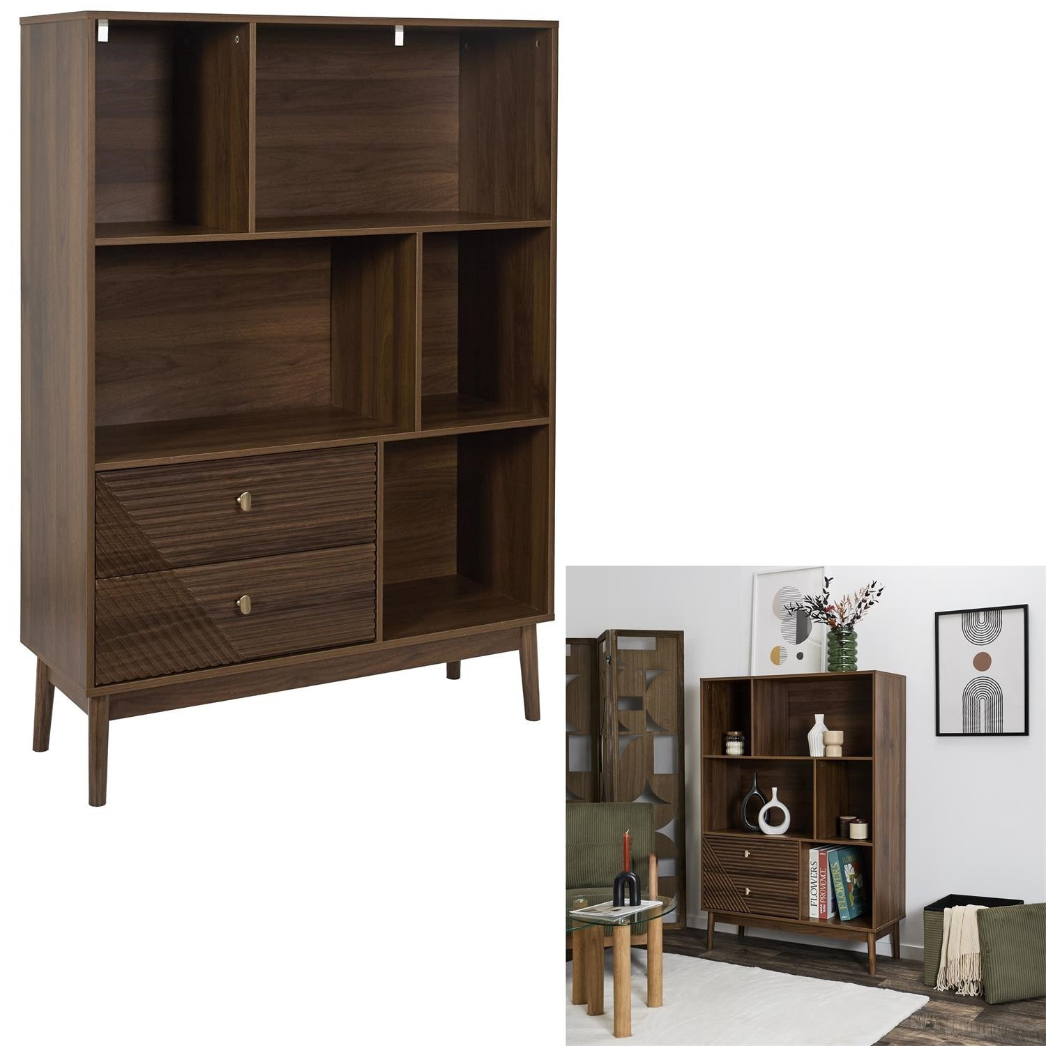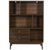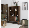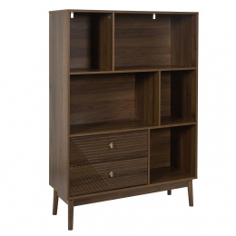 Regál vyžaduje montáž Materiál: MDF deska s dýhou imitující ořech. Nohy borovicové dřevo, úchyty kov. Komoda vybavená 2 zásuvkami na kovových kuličkových pojezdech. Asymetrické police dodají nábytku Max moderní vzhled. zatížení nábytku 50 kg.