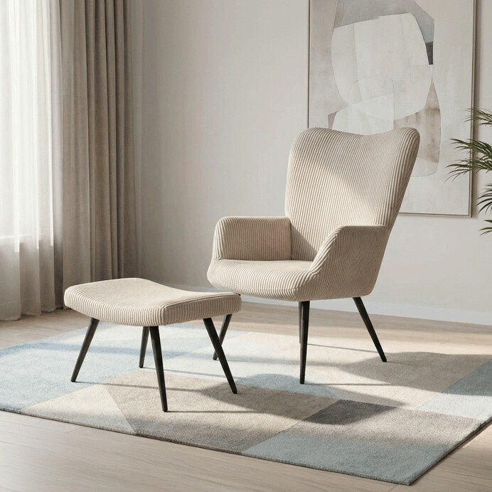 Relaxační křeslo s podnožkou v béžovém manšestru nabízí pohodlné posezení s dostatečnou oporou díky čalouněným područkám a vysokému opěradlu. Potah z manšestrové látky přináší příjemnou texturu a vizuální efekt, který podtrhuje útulný charakter křesla. Stabilní černé kovové nohy zajišťují pevnost a dlouhou životnost, přičemž taburet slouží jako praktický doplněk pro odpočinek nohou. Křeslo není otočné ani rozkládací, což podtrhuje jeho jednoduchost a funkčnost v interiéru. Díky svým rozměrům a designu je vhodné do obývacích pokojů i relaxačních zón.