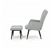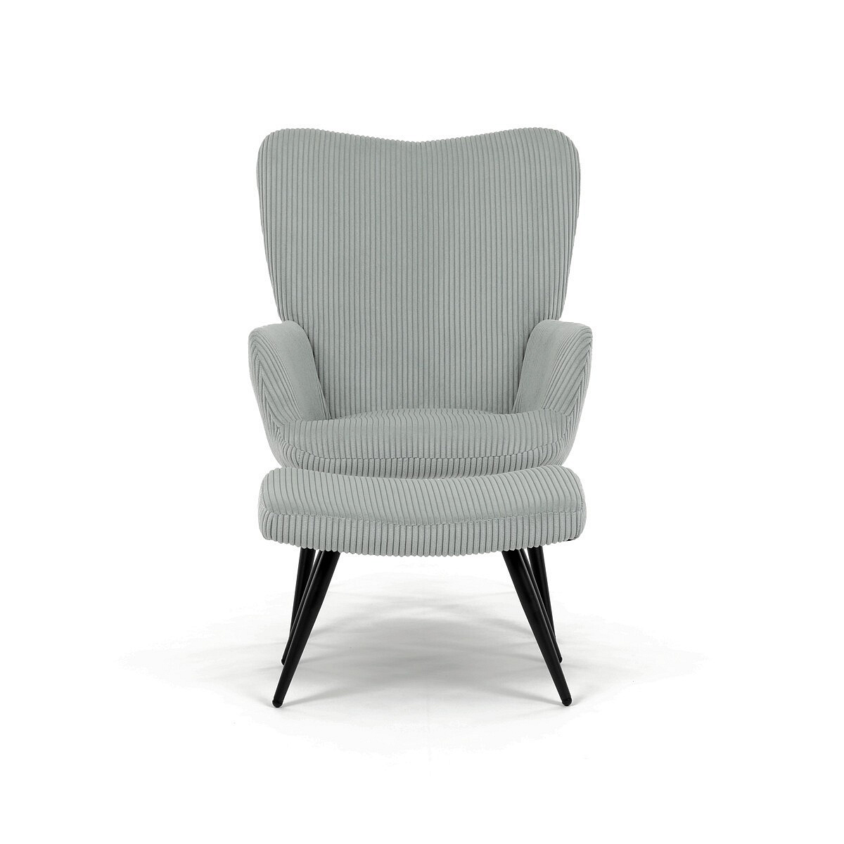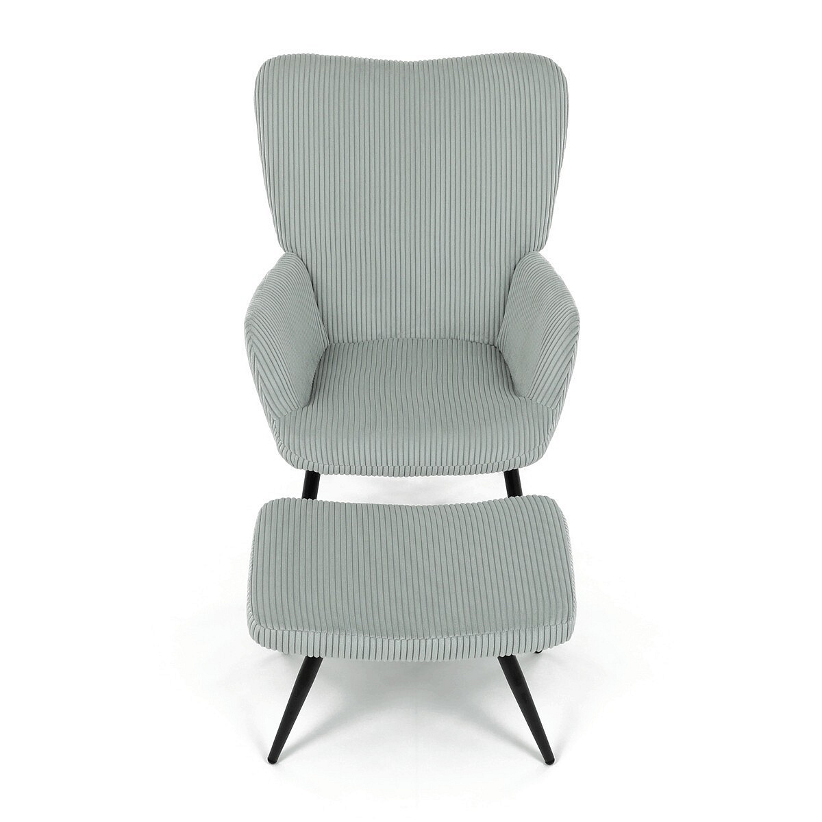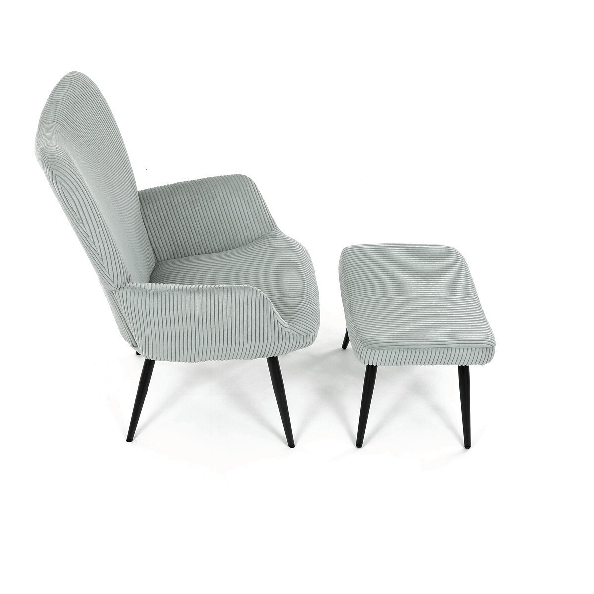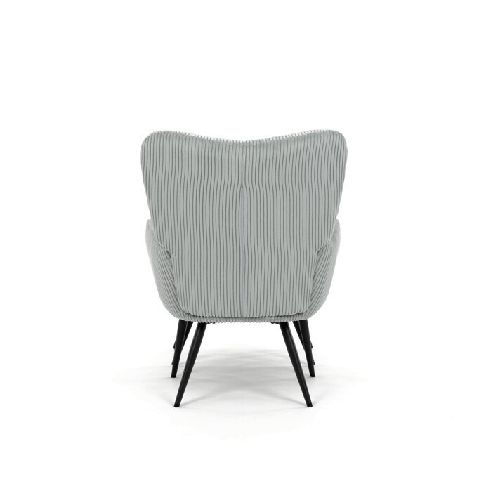 Relaxační křeslo s podnožkou v modrém manšestru nabízí pohodlné posezení díky měkkému čalounění a ergonomicky tvarovaným područkám. Pevné černé kovové nohy zajišťují stabilitu a dlouhou životnost. Manšestrová látka dodává křeslu příjemnou texturu a vizuální hloubku, která se hodí do moderních i klasických interiérů. Součástí je praktický taburet pro pohodlné opření nohou, který sdílí stejný design a materiál. Křeslo není otočné ani rozkládací, což podtrhuje jeho jednoduchost a funkčnost.