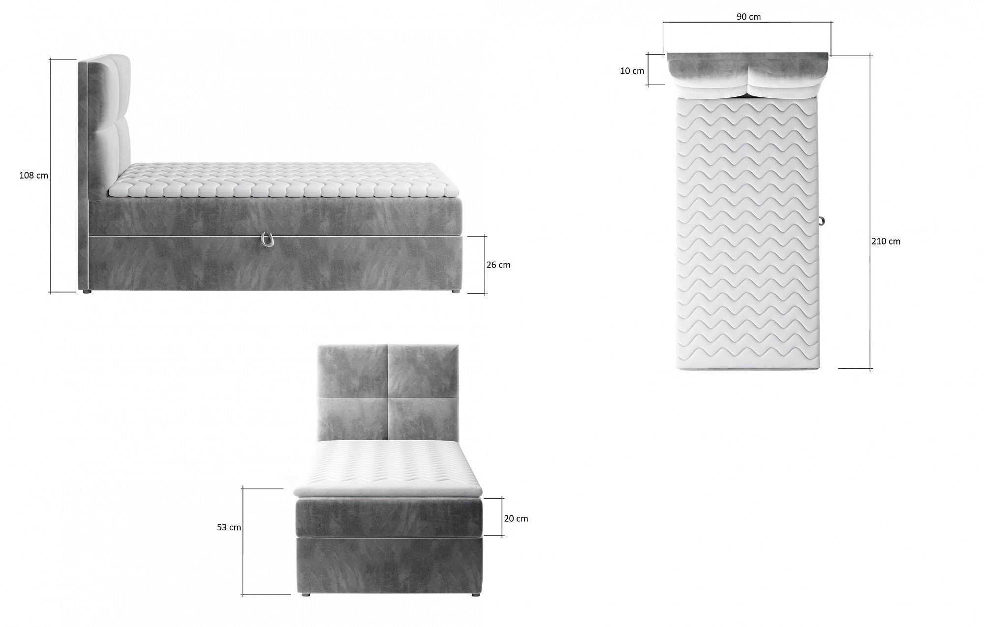 Rivia je klasická stylová a velmi vkusná postel, která bude ideálním kusem nábytku v jakékoli ložnici - ať už v pokoji vašeho dítěte nebo v pokoji připraveném pro hosty - Rivia je vždy trefa do černého. Povrch postele o rozměrech 90 x 200 cm, stejně jako její výplň z boneolu a pěny T25, zaručuje zdravý spánek, protože tento typ matrace podporuje tělo ve správné poloze během odpočinku. Navzdory tomu, že postel Arco působí minimalisticky a kompaktně, je v ní umístěn prostorný úložný prostor na lůžkoviny s látkovým úchytem. Mezi další charakteristické rysy patří vysoké sedadlo o výšce 53 centimetrů a nohy o délce 3 centimetry. Boxspring Rivia je ideální volbou, pokud hledáte dokonalou jednolůžkovou postel do vaší ložnice. Rivia je synonymem pro menší velikost v kombinaci s maximálním pohodlím.