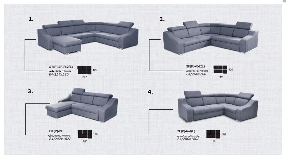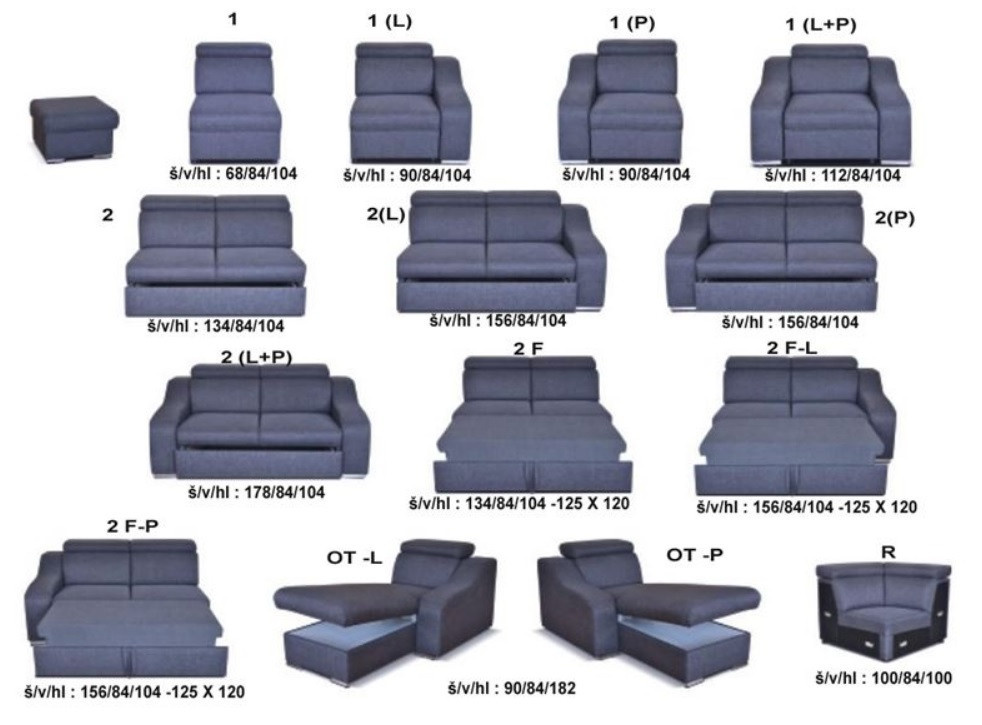 Rozměry sedací soupravy v jednotlivých variantách (šíře x výška x hloubka):