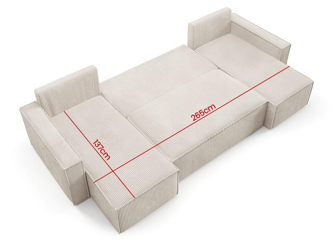 Jednou z největších výhod této sedací soupravy je její rozkládací funkce. Snadno ji přeměníte na pohodlné lůžko s plochou na spaní o rozměrech 265x137 cm. To je ideální řešení pro hosty, kteří u vás zůstanou přes noc, nebo pro chvíle, kdy si chcete dopřát odpočinek během dne.