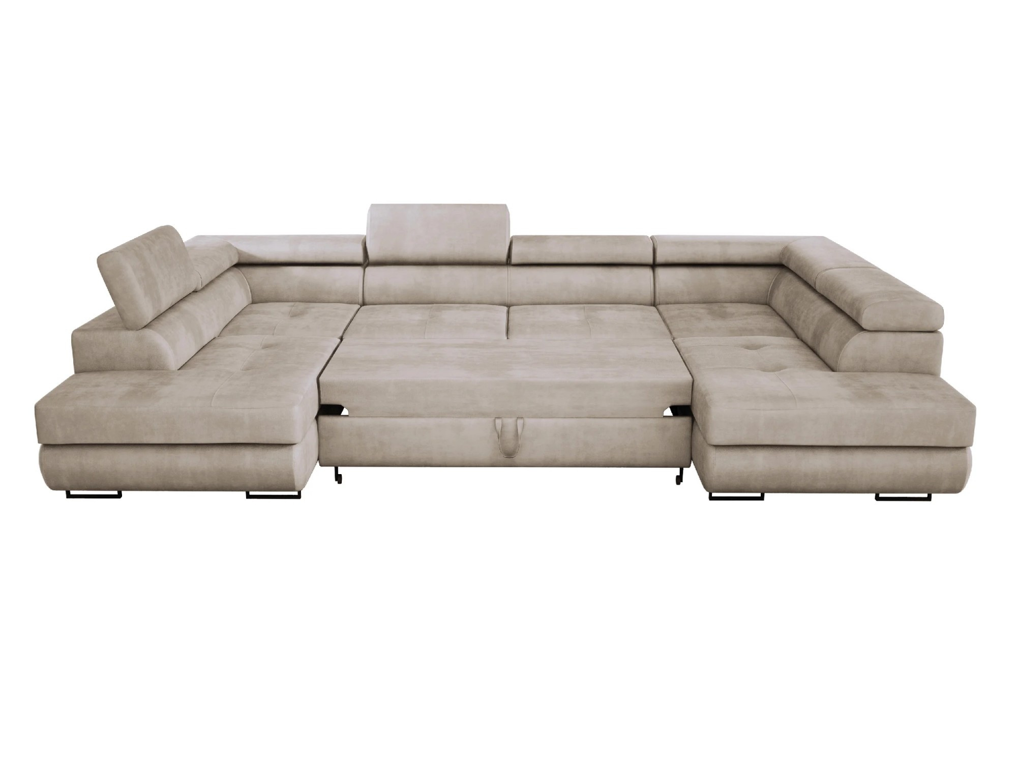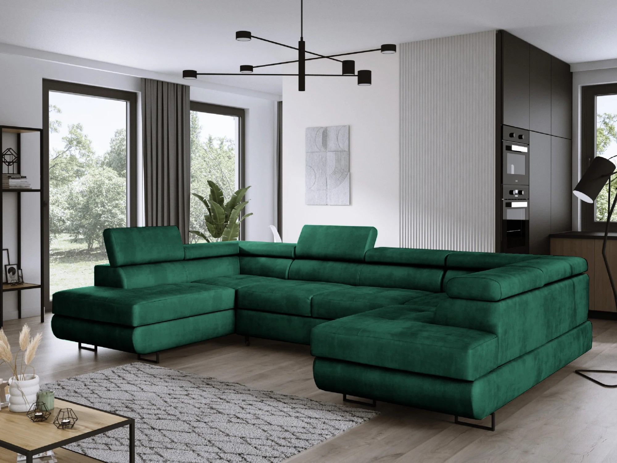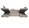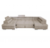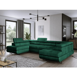 Prostorná, moderní a rozkládací rohová sedačka Anton ve tvaru U Rohová sedačka Anton ve tvaru U je ideální volbou pro ty, kteří si cení prostoru, pohodlí a moderního stylu. Tento velký nábytek o rozměrech 350 × 202 cm poskytuje spoustu místa pro každodenní odpočinek a jeho elegantní design se dokonale hodí k moderním interiérům. Pokud hledáte stylovou a funkční rohovou sedačku, model Anton splní všechna vaše očekávání. Jeho pevná konstrukce usazená na vysokých kovových nohách mu dodává lehkost a pečlivě provedené prošívání a švy zdůrazňují jeho elegantní charakter. Regulovatelné opěrky hlavy umožňují individuální nastavení úhlu opěradla, což zajišťuje maximální pohodlí. Široká škála tkanin a barev zajišťuje, že rohová sedačka dokonale zapadne do různých interiérových aranžmá. Kromě estetiky se rohová sedačka Anton vyznačuje také vysokou funkčností. Díky systému rozkládání delfín během několika okamžiků přeměníš na pohodlnou postel o rozměrech 260 × 130 cm. Dva velké úložné prostory na ložní prádlo skryté v otomanech poskytují dodatečný úložný prostor. Komfort užívání zaručuje pružinové sedadlo vyplněné elastickou pěnou a vysoce kvalitní potahová látka je odolná proti skvrnám a oděru, což usnadňuje udržení nábytku v dokonalém stavu. Vlastnosti produktu Čtyři nastavitelné opěrky hlavy s pětistupňovým nastavením – přizpůsobte si ideální úhel opěradla. Čalouněné opěradlo – rohová sedačka vypadá skvěle z každé strany, takže ji můžete umístit kamkoli. Odolná konstrukce vyrobená z masivního dřeva a nábytkové desky – pevnost na dlouhá léta. Úložné prostory na ložní prádlo skryté pod otomany – praktické řešení pro ukládání. Snadný systém rozkládání delfín – rychlá přeměna rohové sedačky na prostornou postel. Komfortní sedadlo – vlnité pružiny a elastická pěna zajišťují pohodlí. Stylové detaily – elegantní prošívání a pečlivé švy zdůrazňují moderní charakter nábytku. Rozměry rohové sedačky, plocha na spaní: 260 × 130 cm, šířka: 350 cm, hloubka: 202 cm, výška: 90 cm, výška sedáku: 43 cm, hloubka sedáku: 65 cm, rozměr opěrky hlavy: 30 × 72 cm. *Všechny rozměry jsou uváděny s tolerancí +/- 3 cm