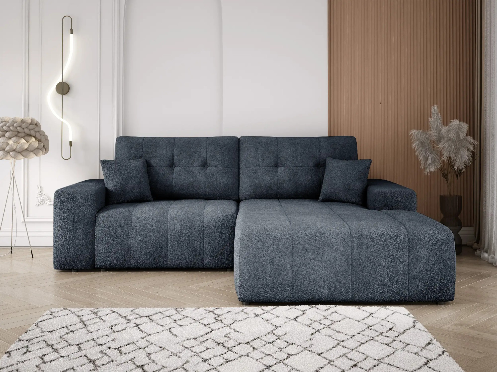Poznej rohovou sedačku do obývacího pokoje Gaja – styl, který jde ruku v ruce s funkčností. Rohová sedačka Gaja s funkcí spaní je kombinací jedinečného designu a každodenního pohodlí. Jeho široká otomana a dva velké, měkké opěrné polštáře zajišťují komfort na nejvyšší úrovni – jak při sezení, tak při relaxaci v ležící poloze. To je ideální volba pro prostorný obývací pokoj, kde záleží nejen na vzhledu, ale i na pohodlí obyvatel. Klíčovou předností rohové sedačky Gaja je funkce spaní, která se díky DL mechanismu rozkládá rychle a bez námahy. To praktické řešení pro nečekanou návštěvu hostů nebo každodenní zdřímnutí – bez nutnosti rezignovat na estetiku. Sedák byl postaven na bázi bonellových pružin a vysoce elastické pěny, což se promítá do trvanlivosti, pružnosti a ideálního přizpůsobení tělu. Pružiny bonell rovnoměrně rozkládají váhu a pěna zaručuje odolnost proti deformacím – i při intenzivním používání. Další výhodou je úložný prostor na ložní prádlo ukrytý pod sedákem. To chytré řešení, které pomáhá udržovat pořádek a maximálně využívat dostupný prostor – zejména v menších bytech. Rohová sedačka Gaja je dostupná v široké škále vysoce kvalitních látek, které nejen skvěle vypadají, ale jsou také příjemné na dotek a snadno se udržují v čistotě. Díky tomu si tento rohový gauč zachová svůj estetický vzhled po dlouhá léta. Užij si každodenní pohodlí a styl s rohovou sedačkou Gaja – navrženou s ohledem na tebe a tvůj obývací pokoj. Vlastnosti produktu Konstrukce rohové sedačky je vyrobena z dřevotřísky a borovicového dřeva, což zaručuje stabilitu a trvanlivost nábytku. V sedáku a opěradle byly použity bonellové pružiny v kombinaci s vysoce elastickou pěnou – to je osvědčené řešení zajišťující odolnost proti deformacím a každodenní pohodlí. Plastové nožky se vyznačují lehkostí a chrání podlahu před poškrábáním. Čalouněná záda ve stejné látce jako celý nábytek umožňují umístit rohovou sedačku kdekoli – i uprostřed obývacího pokoje. Komplet dvou velkých opěrných polštářů a dvou malých polštářků zajišťuje pohodlnou oporu a estetické doplnění aranžmá. Funkce spaní s plochou 190 × 140 cm umožňuje pohodlný odpočinek jak během dne, tak i při příležitostném přenocování. Automat DL umožňuje rychlé a intuitivní rozložení rohové sedačky, přeměňujíc ji během několika okamžiků na pohodlnou postel. Rohová sedačka je k dispozici v levostranné nebo pravostranné verzi – vyberte si vhodnou stranu otevírání, která se hodí do vašeho interiéru. Hluboký úložný box na ložní prádlo pojme deky, polštáře a další textilie, což pomáhá udržet pořádek v obývacím pokoji. Rozměry rohové sedačky, plocha na spaní: 195 × 140 cm, šířka: 245 cm, hloubka: 94 cm, hloubka otomanu: 165 cm, výška: 95 cm, výška sedáku: 46 cm, hloubka sedáku: 60 cm, výška opěradla: 50 cm. *Všechny rozměry jsou uváděny s tolerancí +/- 3 cm