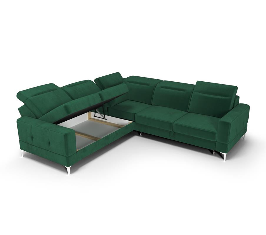 Rohová sedačka má nastavitelné, vícestupňové opěrky hlavy, chromované ozdobné nožky, sedáky s ozdobným prošíváním, které jsou vyrobeny na vlnitých pružinách a vysoce elastické pěně, což zajišťuje vysoký komfort používání a zabraňuje deformaci nejčastěji používaných ploch.