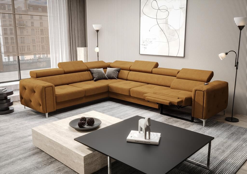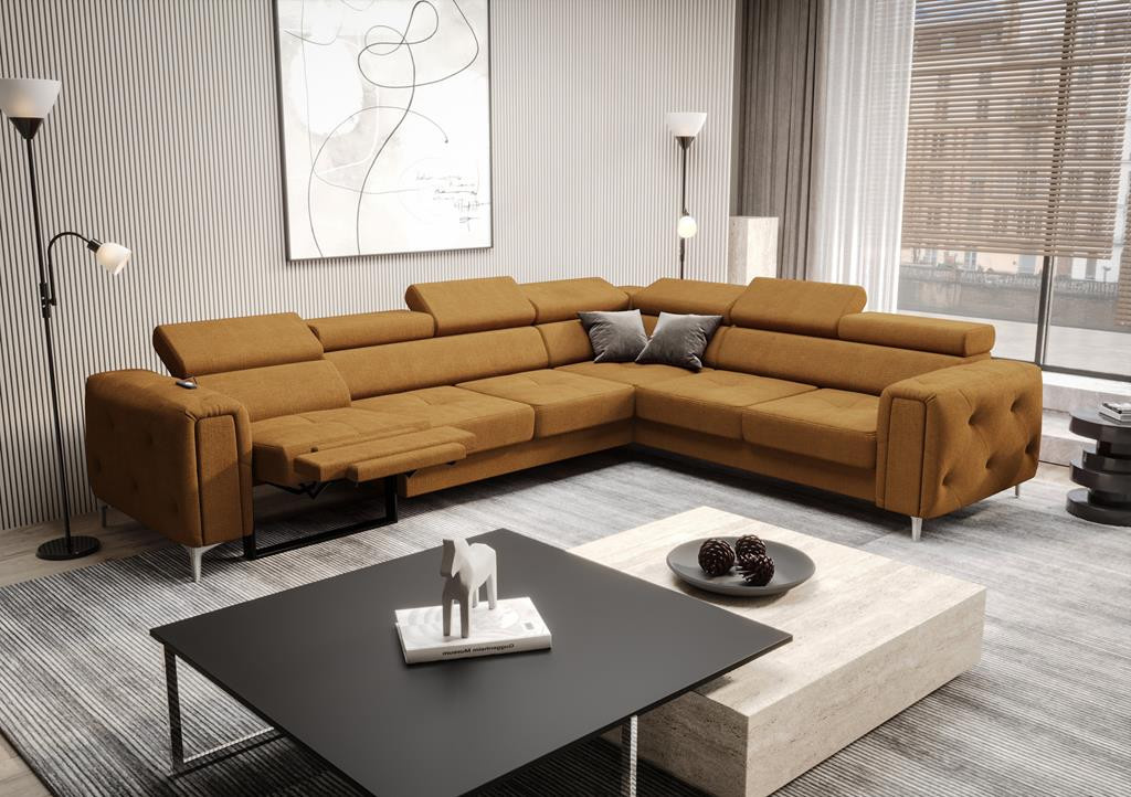 Rohová sedačka s relaxační funkcí Orion I s funkcí spaní, nastavitelnými opěrkami hlavy, ozdobným prošíváním a možností výběru nohou je dokonalým spojením komfortu a elegance. Úložný prostor na ložní prádlo a prošívaná strana ve stylu glamour z něj činí výjimečný kus nábytku, který splní očekávání i těch nejnáročnějších uživatelů. Prohlédni si celou kolekci Orion. Vyberte si rohovou sedačku, která dodá vašemu interiéru jak funkčnost, tak styl.