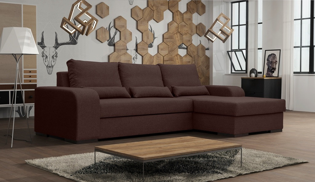 Tvarovaná rohová pohovka VIRAGO s bočnicemi najde své ideální místo v obývacím pokoji. Rohová sedací souprava je pohodlná pro každodenní používání a její součástí jsou dekorativní polštáře, které zajišťují maximální pohodlí při sezení. Rohová sedací souprava ve tvaru písmene L je k dispozici v pravostranném nebo levostranném provedení, takže si ji každý může přizpůsobit uspořádání místnosti. Rohová sedací souprava je vybavena funkcí spaní, díky níž je možné ji rozložit. Rohová pohovka pro více osob má také prostorný úložný prostor na lůžkoviny pro uložení přikrývek, peřin a polštářů. Nábytek s dřevěným rámem stojí na dřevěných nohách v barvě tmavého ořechu. Volně stojící rohová sedací souprava je vyplněna vlnitými pružinami a čalounickou pěnou, díky čemuž si rohová sedací souprava zachová správnou pružnost a nevzniknou na ní nevzhledné deformace ani promáčkliny. Model VIRAGO je čalouněný látkou, jejíž barvy si lze vybrat podle individuálních preferencí z bohatého vzorníku.